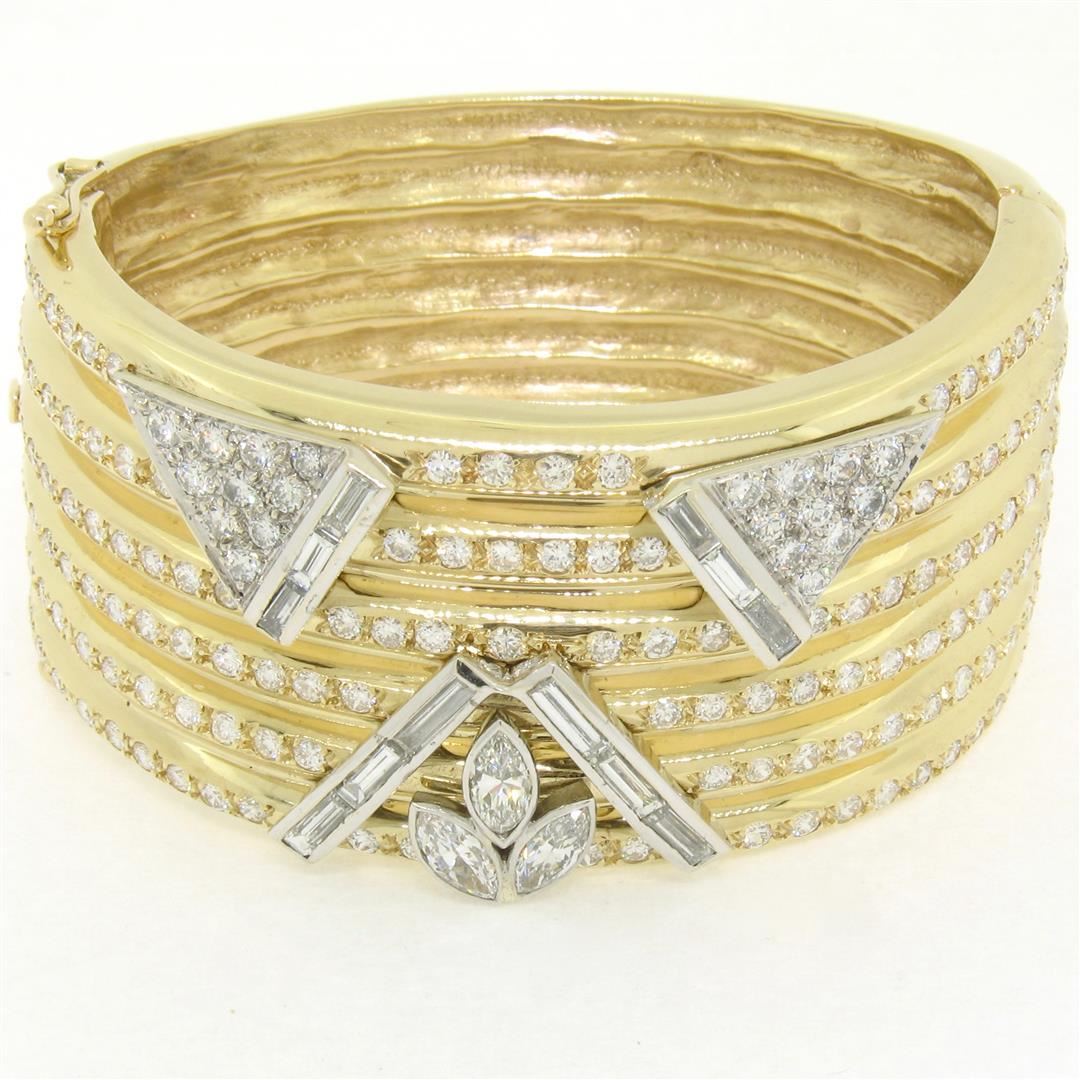 One Vintage Custom 14k Two Tone Gold Ribbed 6.25" 12ctw Diamond Wide Bangle Cuff Bracelet. Item Details - Material: Solid 14k Yellow Gold, Weight: 102.58 Grams, Stone(s): (3) Natural Genuine Diamonds - Marquise Cut - Bezel Set - F to H Color - VVS2 to VS2 Clarity - 1.80ctw (approx.), (12) Natural Genuine Diamonds - Straight Baguette Cut - Channel Set - F to H Color - VVS2 to VS2 Clarity - 3.20ctw (approx.), (171) Natural Genuine Diamonds - Round Brilliant Cut - Pavé Set - F to H Color - VVS2 to VS2 Clarity - 7.00ctw (approx.), Total Carat Weight: 12.00 (approx.), Clasp: Box Clasp w/ Dual Safety Latches (Very secure!), Size: Will fit up to a 6.25" wrist, Width: Inside: 56.33mm (2.21") - Outside: 66.80mm (2.63"), Height: Inside: 50.09mm (1.97") - Outside: 61.12mm (2.40"), Thickness: 7.42mm rise off the wrist, Condition: Vintage custom made bracelet. Excellent, ready to wear condition!