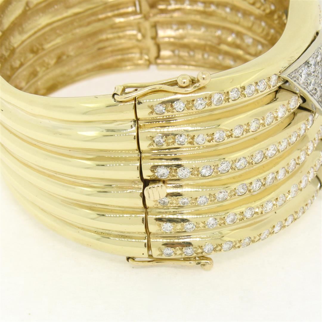 One Vintage Custom 14k Two Tone Gold Ribbed 6.25" 12ctw Diamond Wide Bangle Cuff Bracelet. Item Details - Material: Solid 14k Yellow Gold, Weight: 102.58 Grams, Stone(s): (3) Natural Genuine Diamonds - Marquise Cut - Bezel Set - F to H Color - VVS2 to VS2 Clarity - 1.80ctw (approx.), (12) Natural Genuine Diamonds - Straight Baguette Cut - Channel Set - F to H Color - VVS2 to VS2 Clarity - 3.20ctw (approx.), (171) Natural Genuine Diamonds - Round Brilliant Cut - Pavé Set - F to H Color - VVS2 to VS2 Clarity - 7.00ctw (approx.), Total Carat Weight: 12.00 (approx.), Clasp: Box Clasp w/ Dual Safety Latches (Very secure!), Size: Will fit up to a 6.25" wrist, Width: Inside: 56.33mm (2.21") - Outside: 66.80mm (2.63"), Height: Inside: 50.09mm (1.97") - Outside: 61.12mm (2.40"), Thickness: 7.42mm rise off the wrist, Condition: Vintage custom made bracelet. Excellent, ready to wear condition!