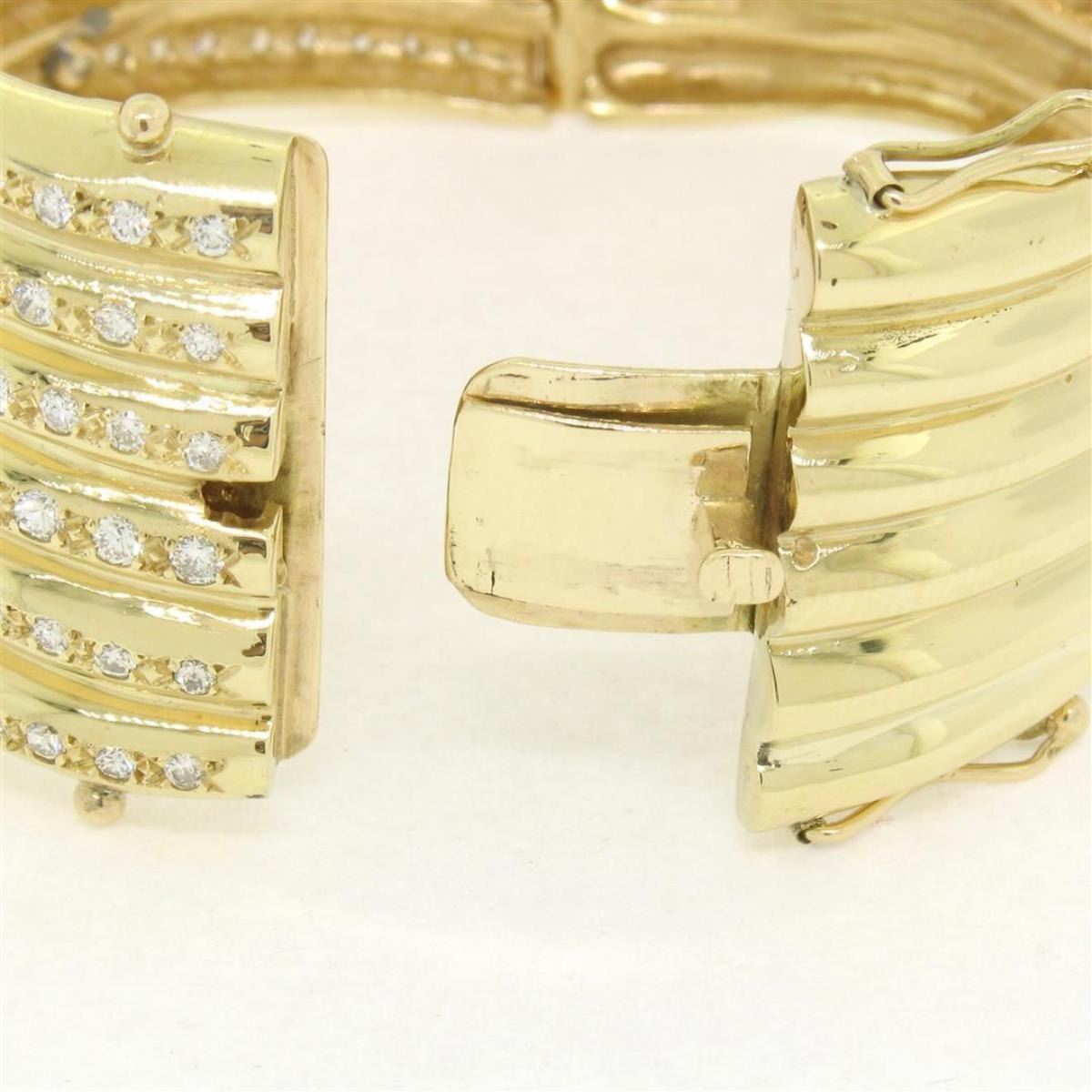 One Vintage Custom 14k Two Tone Gold Ribbed 6.25" 12ctw Diamond Wide Bangle Cuff Bracelet. Item Details - Material: Solid 14k Yellow Gold, Weight: 102.58 Grams, Stone(s): (3) Natural Genuine Diamonds - Marquise Cut - Bezel Set - F to H Color - VVS2 to VS2 Clarity - 1.80ctw (approx.), (12) Natural Genuine Diamonds - Straight Baguette Cut - Channel Set - F to H Color - VVS2 to VS2 Clarity - 3.20ctw (approx.), (171) Natural Genuine Diamonds - Round Brilliant Cut - Pavé Set - F to H Color - VVS2 to VS2 Clarity - 7.00ctw (approx.), Total Carat Weight: 12.00 (approx.), Clasp: Box Clasp w/ Dual Safety Latches (Very secure!), Size: Will fit up to a 6.25" wrist, Width: Inside: 56.33mm (2.21") - Outside: 66.80mm (2.63"), Height: Inside: 50.09mm (1.97") - Outside: 61.12mm (2.40"), Thickness: 7.42mm rise off the wrist, Condition: Vintage custom made bracelet. Excellent, ready to wear condition!
