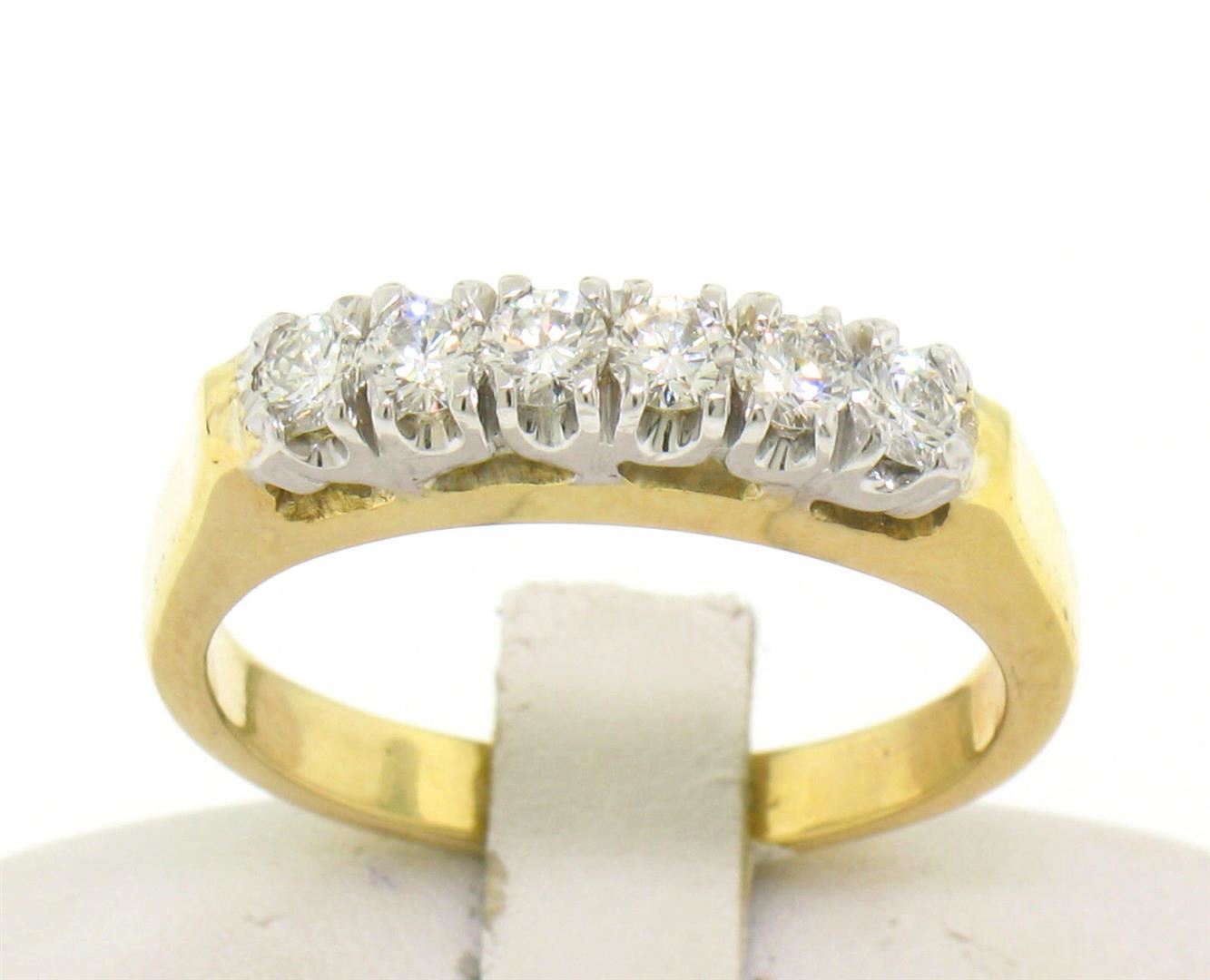 An estate solid 14k yellow and white gold band ring. with 6 brilliant cut natural diamonds (F - VS1; 0.60ctw). The ring is size 9.0, weighs a total of 6.60 grams, and measures 19.75mm wide.