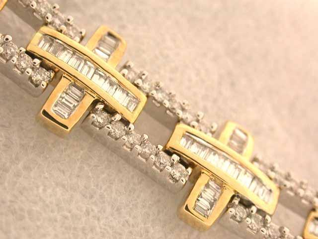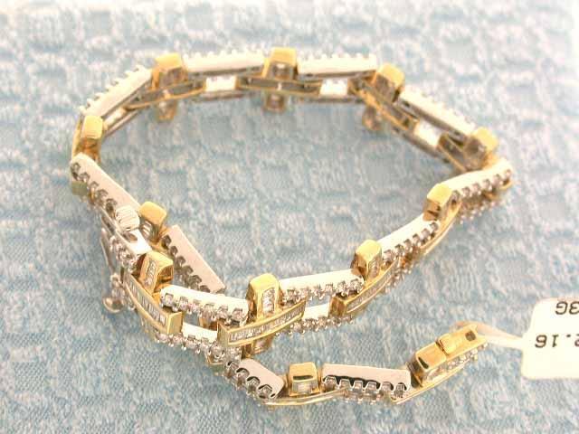 14k Two Toned Gold Bracelet with Diamonds. The Diamonds are 1.79 carats, G color and VS clarity and Baguettes Diamonds are 2.16 carats, G color and VS clarity. Its length is 7 inches long and weighs 23.63 grams.