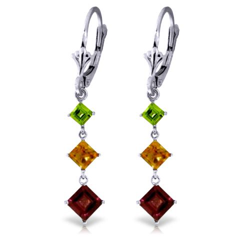 Show off a rainbow of dazzling colors with these 14k chandelier earrings with peridot, citrine, and garnet. Those who love to mix and match gemstones will be thrilled with these stunning earrings, combining three beautiful colors for a dramatic effect. Square shaped garnet, citrine, and peridot mesh beautifully with 4.80 carats of pure dazzle and glitz, with a total of six natural and genuine stones that dangle elegantly from the ears. Leverbacks made of 14k white gold makes these chandelier earrings easy to wear and gives them just the right amount of movement to turn heads. This jewelry piece is shipped in an elegant black jewelry box and is accompanied by an Appraisal Certificate. Retail price: $2025