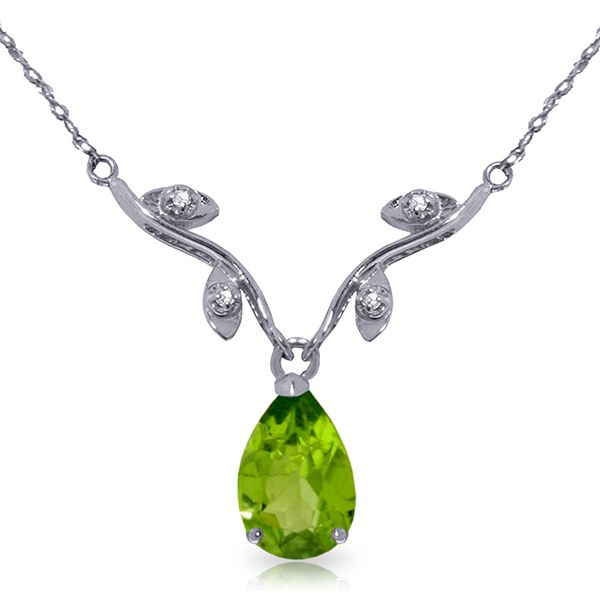 The look of nature comes alive with stunning green gemstones and a beautiful vine-like design on this 14k white gold necklace with natural diamond and peridot. This stunning necklace begins with a beautiful rope chain that is a total of 18 inches in length and available in 14k yellow, white, or rose gold. Gold bars that resemble vines are attached to the chain and contain four golden leaves set with four round cut natural diamonds. A glowing pear cut peridot hangs beautifully on this necklace, with a total of 1.50 carats for ultimate sparkle and shine radiating from the bright and beautiful stone. This jewelry piece is shipped in an elegant black jewelry box and is accompanied by an Appraisal Certificate. Retail price: $1259