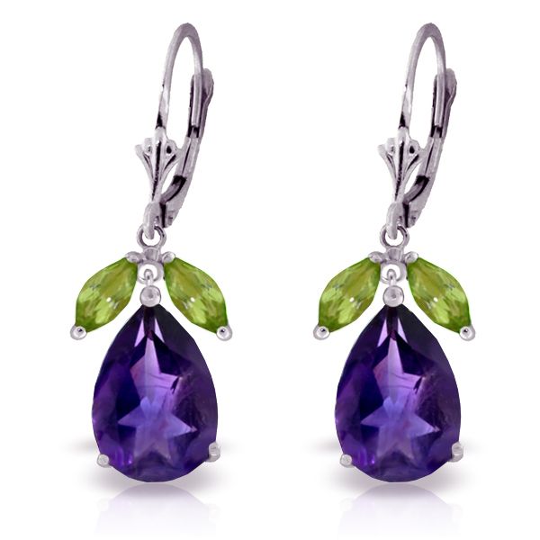 These stunning earrings are perfect for anyone who loves the gorgeous contrast of Amethyst against the fresh green of Peridot. These 14k Solid Gold Leverback Earring with Peridots & Amethysts feature two large pear-shaped Amethyst gemstones, each weighing in at 12 full carats. Each Amethyst is highlighted by a one carat Peridot on either side, for a total of four Peridot stones. Each Peridot is shaped somewhat like a leaf, which gives a botanical feel to these dressy earrings. This unique pair of earrings dangles approx. 1.35 inches in overall height. These gold earrings are lever-back style, which means they are easy to put on and take off. This jewelry piece is shipped in an elegant black jewelry box and is accompanied by an Appraisal Certificate. Retail price: $2507