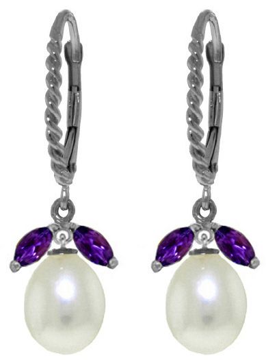 Flanked by two deep purple amethysts, these 14 K. white gold Lever Back Earrings with Amethyst & Pearls ignite feelings of passion and beauty. These earrings are delicate and lovely, and just the right size to wear without discomfort. Each earring piece contains two lovely amethysts that are a deep purple hue, and made without any lab enhancements. Pearls are classic and a must have for any lady. These gold earrings come in white, rose or yellow gold, and you can choose your preference at checkout. Whether they are for a gift or yourself, they are sure to be loved by whomever is wearing them. This jewelry piece is shipped in an elegant black jewelry box and is accompanied by an Appraisal Certificate. Retail price: $1602