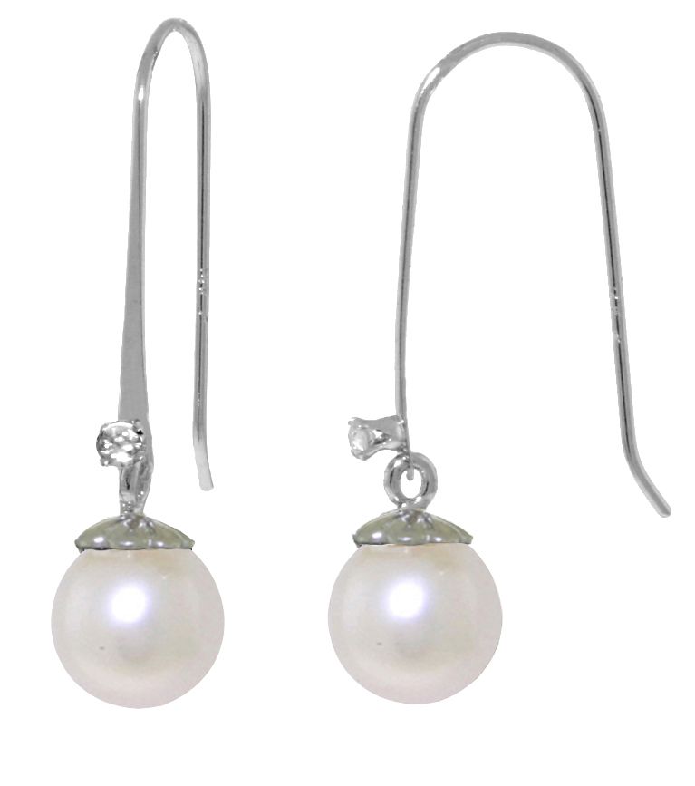 These charming 14 K. white gold Fish Hook Earrings with Diamonds & Pearls are the perfect earrings for any occasion. They work well with a dressy outfit or something simple. Each diamond is a K-M color and SI-1 clarity. The luxurious natural pearl dangles gently from the white gold fish hook earrings, which are available in your choice of yellow, rose or white gold. Each earring has a slight drop of one inch, and hangs just low enough to be noticeable. These earrings make the perfect gift, and are so easy to wear with comfort and ease. She will be thrilled to have these earrings! This jewelry piece is shipped in an elegant black jewelry box and is accompanied by an Appraisal Certificate. Retail price: $589