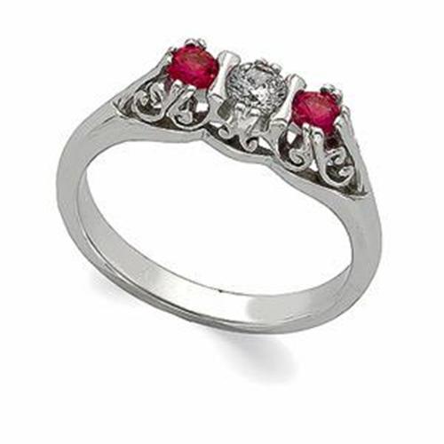 This beautiful '3 Stone Anniversary Band' is 14k White Gold and it features a Sparkling Diamond in the center with a lovely RUBY each side. The Diamond = .15 CARATS and the 2 Rubys = .20 Carats. This Wedding Band is a Size 6 and I can resize it for you either larger or smaller. It IS exquisite!