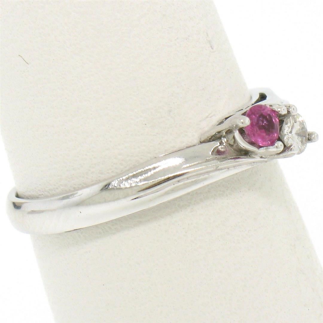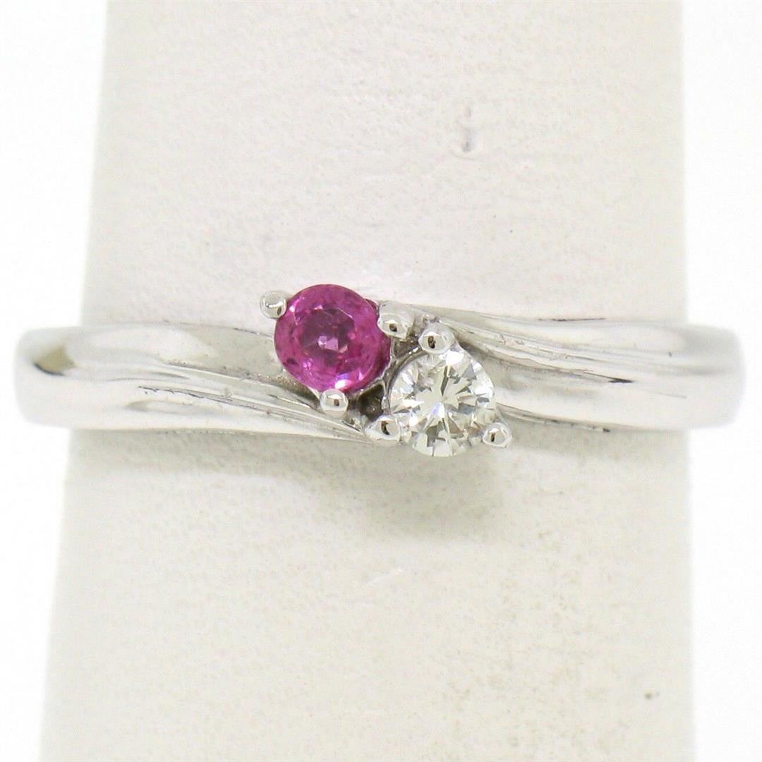 One NEW 14k White Gold 0.17ctw Ruby & Diamond Petite Bypass Promise Birthstone Ring. Item Details: Material: Solid 14k White Gold, Weight: 1.80 Grams, Stone(s): (1) Natural Genuine Diamond - Round Brilliant Cut - Prong Set - G Color - SI1 Clarity - 0.07ct (approx.), (1) Natural Genuine Ruby - Round Cut - Prong Set - Rich Red Color - 0.10ct (approx.), Total Carat Weight: 0.17 (approx.), Ring Size: 6.0, Ring Width: 4.08mm (top of the ring), 3mm (shank), Ring Height: 5.5mm rise off the finger. Condition: Brand New!