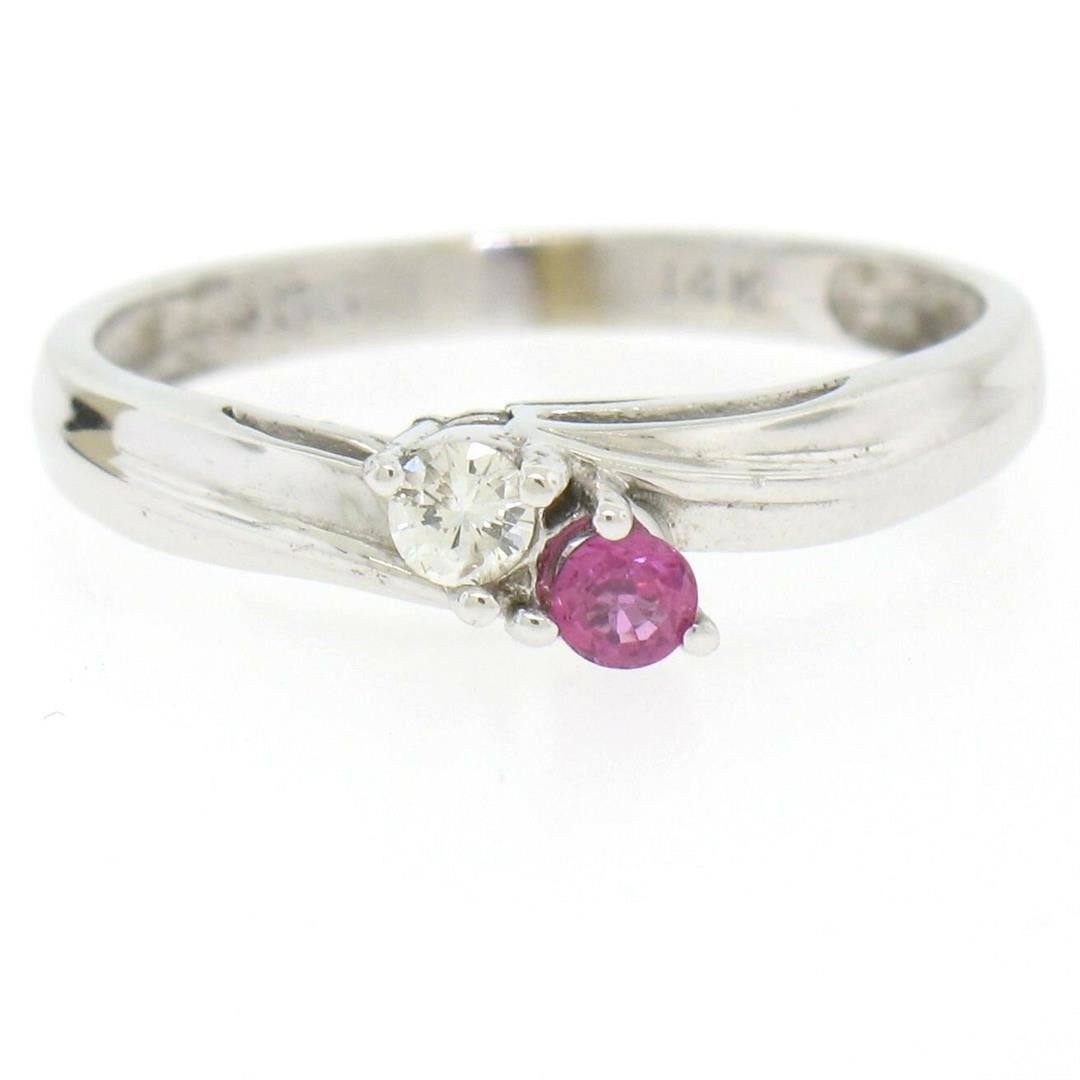 One NEW 14k White Gold 0.17ctw Ruby & Diamond Petite Bypass Promise Birthstone Ring. Item Details: Material:  Solid 14k White Gold, Weight:  1.80 Grams, Stone(s):  (1) Natural Genuine Diamond - Round Brilliant Cut - Prong Set - G Color - SI1 Clarity - 0.07ct (approx.), (1) Natural Genuine Ruby - Round Cut - Prong Set - Rich Red Color - 0.10ct (approx.), Total Carat Weight:  0.17 (approx.), Ring Size:  6.0, Ring Width:  4.08mm (top of the ring), 3mm (shank), Ring Height:  5.5mm rise off the finger. Condition:  Brand New!