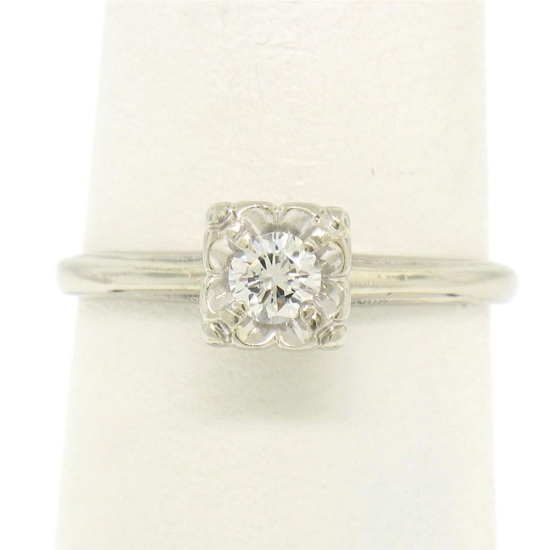 This vintage diamond solitaire ring is crafted in solid 14k white gold and features a gorgeous 0.20 carat round brilliant cut diamond illusion prong set in a floral pattern at its center. The diamond is very fine quality, having colorless F color and exceptionally clean VVS2 clarity. An amazingly brilliant and fiery vintage diamond solitaire mounted in solid 14k gold. Enjoy!