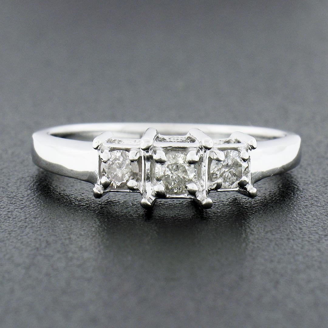 A solid 14k white gold 3 stones ring, with 3 round cut natural diamonds (J - I3 ; 0.22ctw). The ring is size 7.0, weighs a total of 2.67 grams, and measures 5.25mm wide.