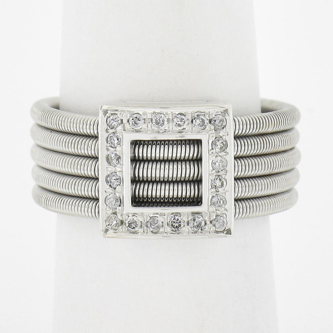 A solid 14k white gold 5 row band ring, with 20 round cut natural diamonds (G/H - I1/I2 ; 0.26ctw). The ring is size 7.5, weighs a total of 10.03 grams, and measures 10.6mm wide.