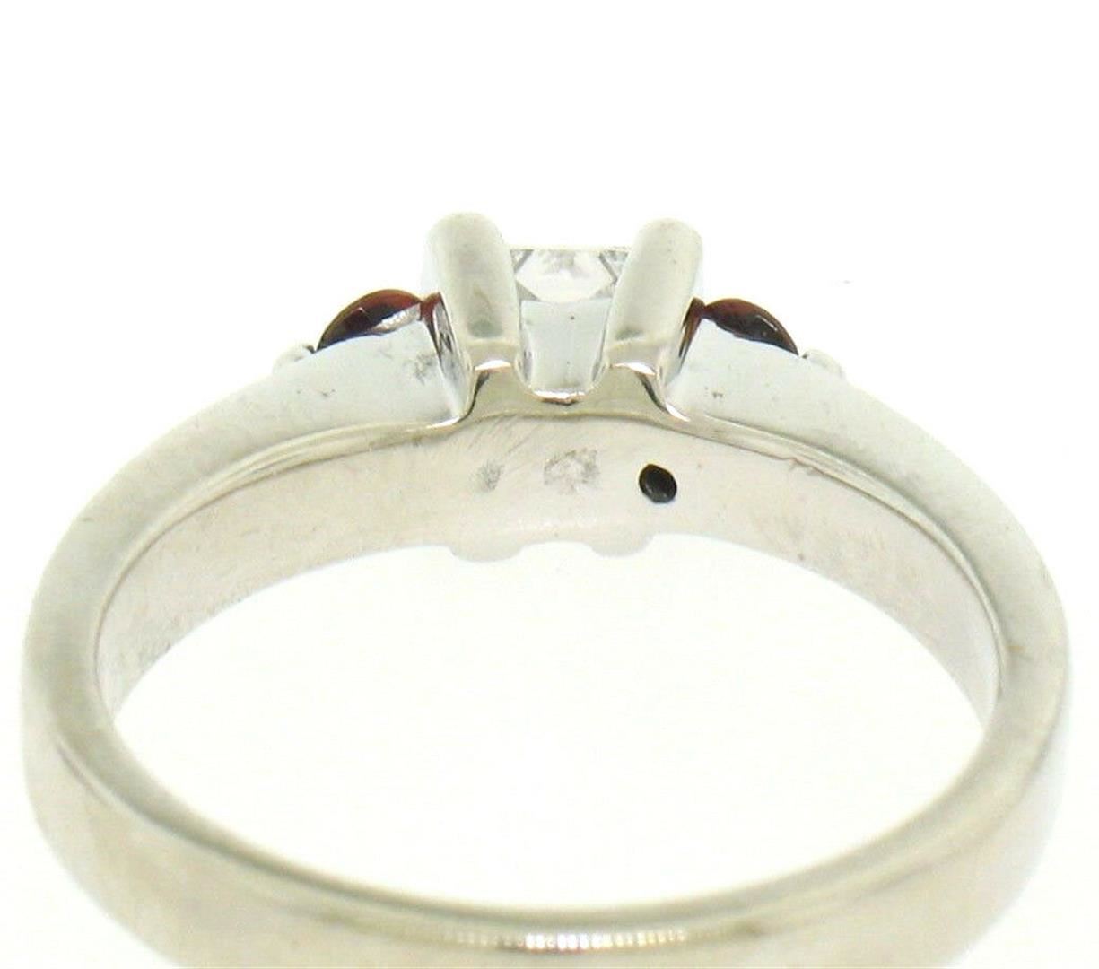 A 14k white gold engagement ring featuring a 0.25ct channel set princess cut diamond (F - VS1) flanked by 2 round brilliant garnets. The ring is size 5.0, weighs a total of 3.9 grams, and measures 5.16mm wide.