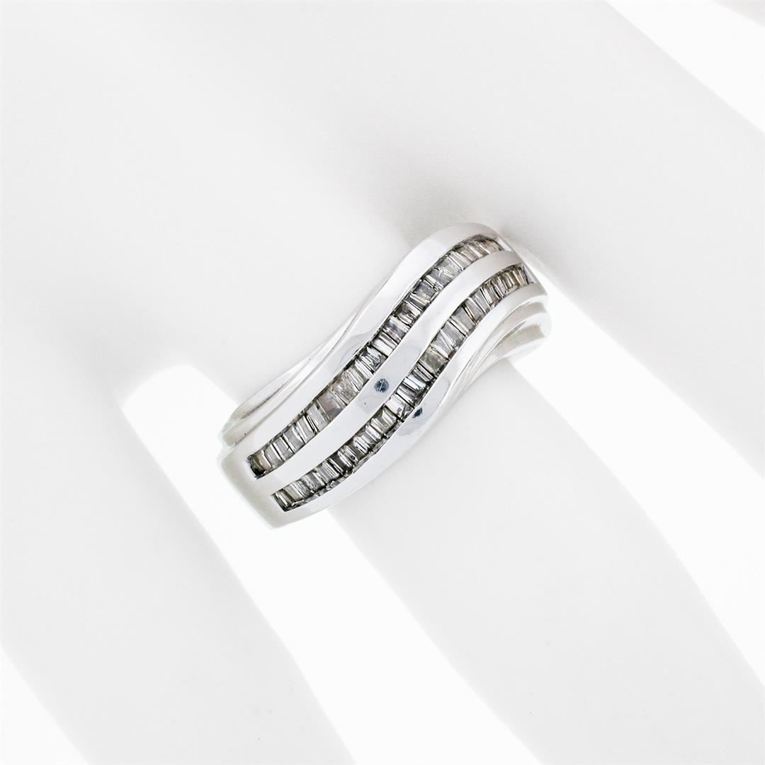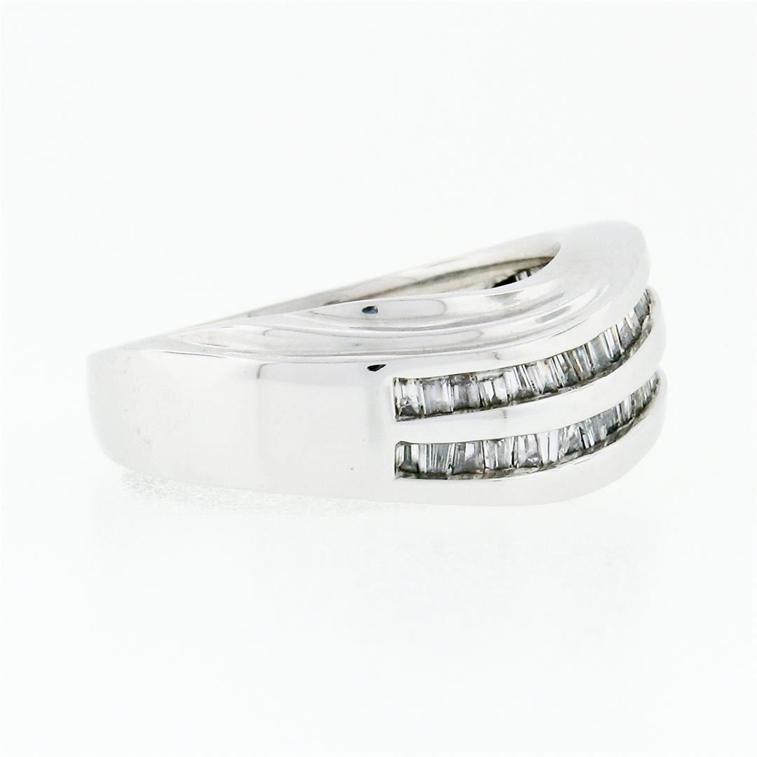 A solid 14k white gold wavy dual band ring with 48 tapered baguette cut natural diamonds (H/I - SI2/I1; 0.75ctw). The ring is size 7.0, weighs a total of 8.03 grams, and measures 8.33mm wide.