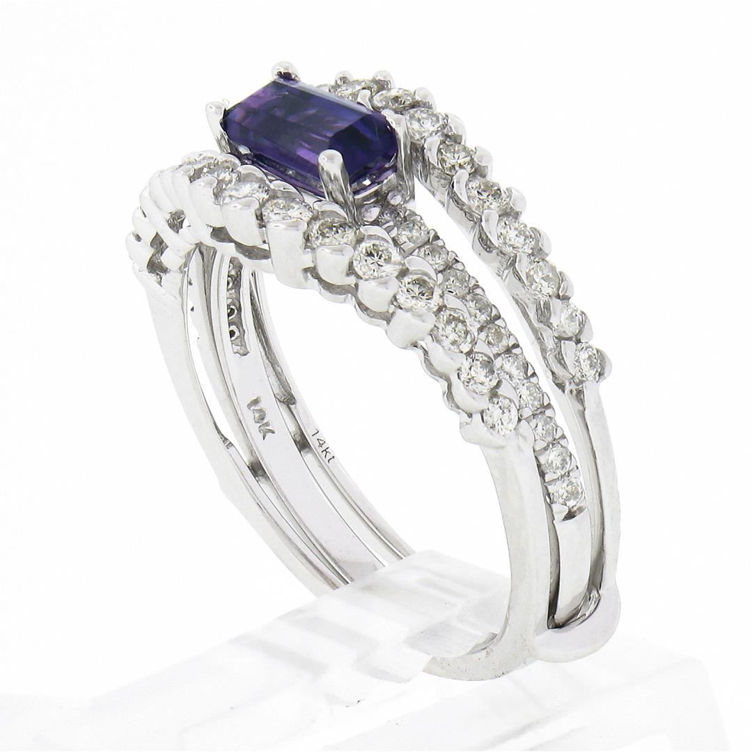 A solid 14k white gold band ring set, with 1 emerald cut natural amethyst (), and 52 round brilliant cut natural diamonds (G/H - SI1/SI2 . 0.47ctw). The ring is size 5, weighs a total of 3.42 grams, and measures 8.4mm wide.