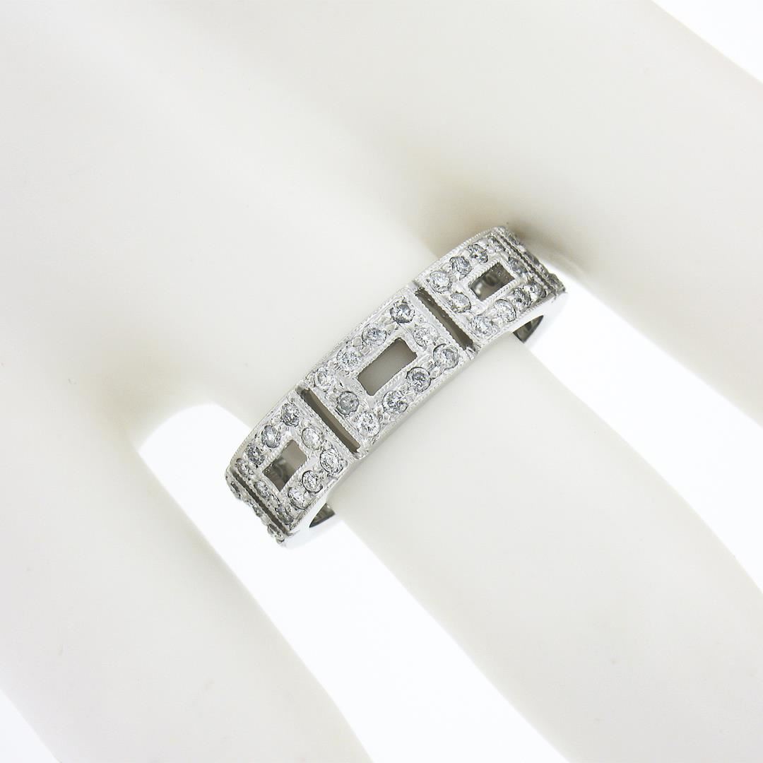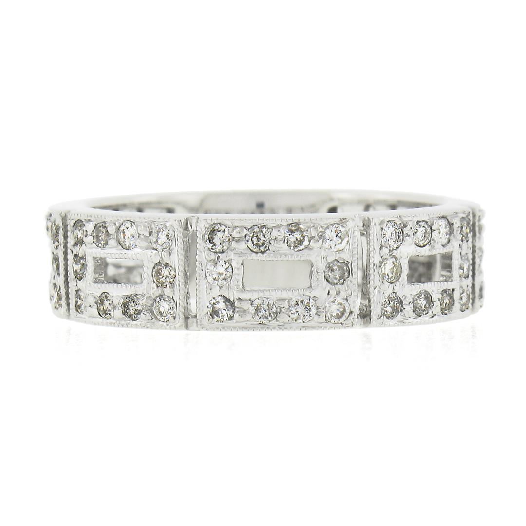 A solid 14k white gold band ring, with 70 round brilliant cut natural diamonds (G/H - I1/I2 ; 0.87ctw). The ring is size 6.5, weighs a total of 3.60 grams, and measures 5.4mm wide.
