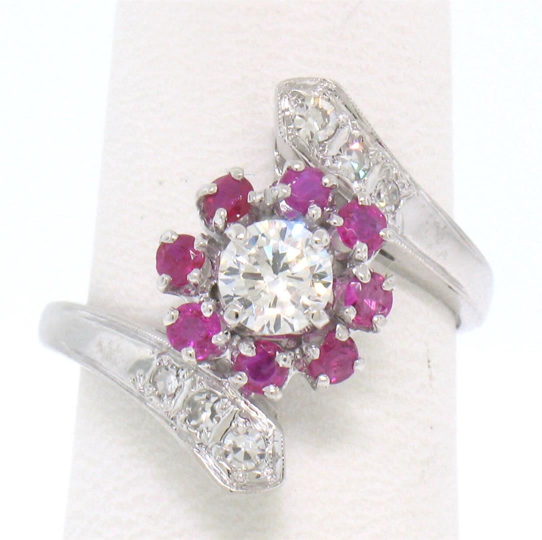 An estate solid 14k white gold offset cocktail ring, with 1 round brilliant cut natural diamond (G- VS1; 0.40ct), surrounded with a halo of 8 round cut natural rubbies (0.48ctw), and 6 single cut natural diamonds (G- VS1; 0.22ctw). The ring is size 6.5, weighs a total of 4.30 grams, and measures 10.54mm wide.