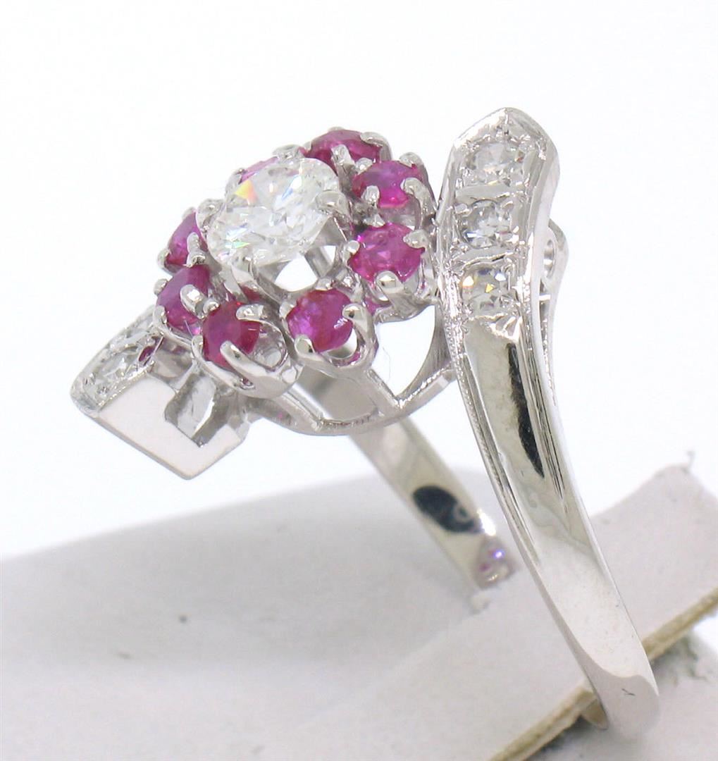 An estate solid 14k white gold offset cocktail ring, with 1 round brilliant cut natural diamond (G- VS1; 0.40ct), surrounded with a halo of 8 round cut natural rubbies (0.48ctw), and 6 single cut natural diamonds (G- VS1; 0.22ctw). The ring is size 6.5, weighs a total of 4.30 grams, and measures 10.54mm wide.