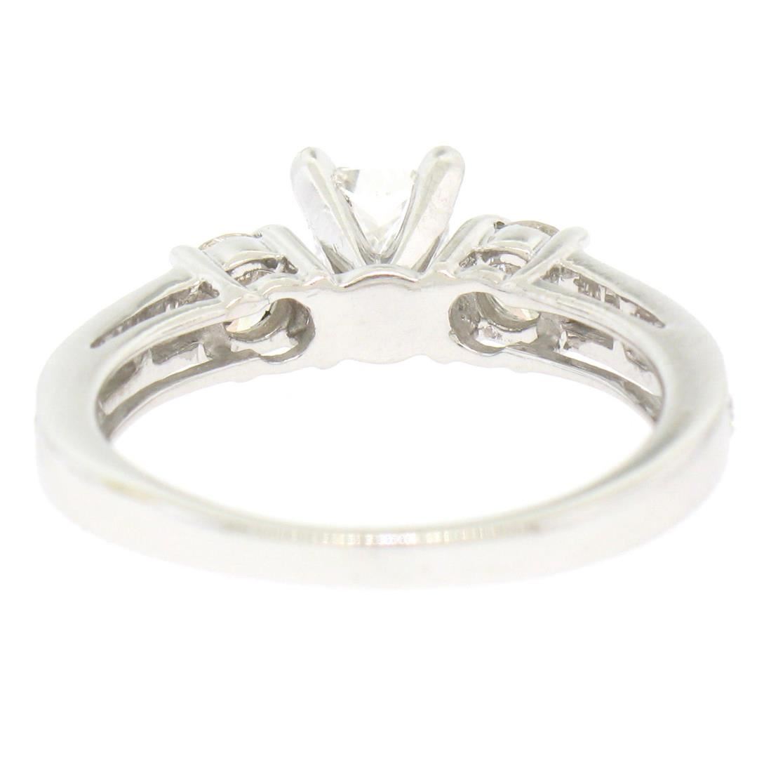 One 14k White Gold 1.10ctw Princess Diamond 3 Stone Engagement Ring w/ Round Accents. Item Details: Material: 14k White Gold, Weight: 2.5 Grams, Stone(s): (1) Natural Genuine Diamond - Princess Cut - Prong Set - G Color - VS2 Clarity - 0.45ct (approx.), (2) Natural Genuine Diamonds - Round Brilliant Cut - Prong Set - G Color - VS2 Clarity - 0.32ctw (approx.), (12) Natural Genuine Diamonds - Round Brilliant Cut - Channel Set - G Color - VS2 Clarity - 0.33ctw (approx.), Total Carat Weight: 1.10 (approx.), Ring Size: 5 (We can custom size this ring.), Ring Width: 5.40mm, Ring Height: 6.67mm rise off the finger, Condition: Like New!