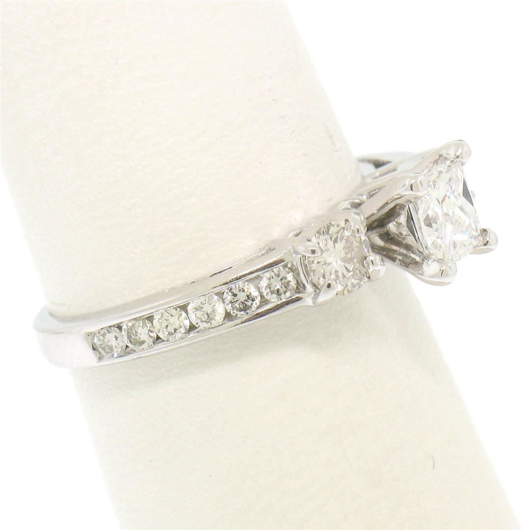 One 14k White Gold 1.10ctw Princess Diamond 3 Stone Engagement Ring w/ Round Accents. Item Details: Material: 14k White Gold, Weight: 2.5 Grams, Stone(s): (1) Natural Genuine Diamond - Princess Cut - Prong Set - G Color - VS2 Clarity - 0.45ct (approx.), (2) Natural Genuine Diamonds - Round Brilliant Cut - Prong Set - G Color - VS2 Clarity - 0.32ctw (approx.), (12) Natural Genuine Diamonds - Round Brilliant Cut - Channel Set - G Color - VS2 Clarity - 0.33ctw (approx.), Total Carat Weight: 1.10 (approx.), Ring Size: 5 (We can custom size this ring.), Ring Width: 5.40mm, Ring Height: 6.67mm rise off the finger, Condition: Like New!