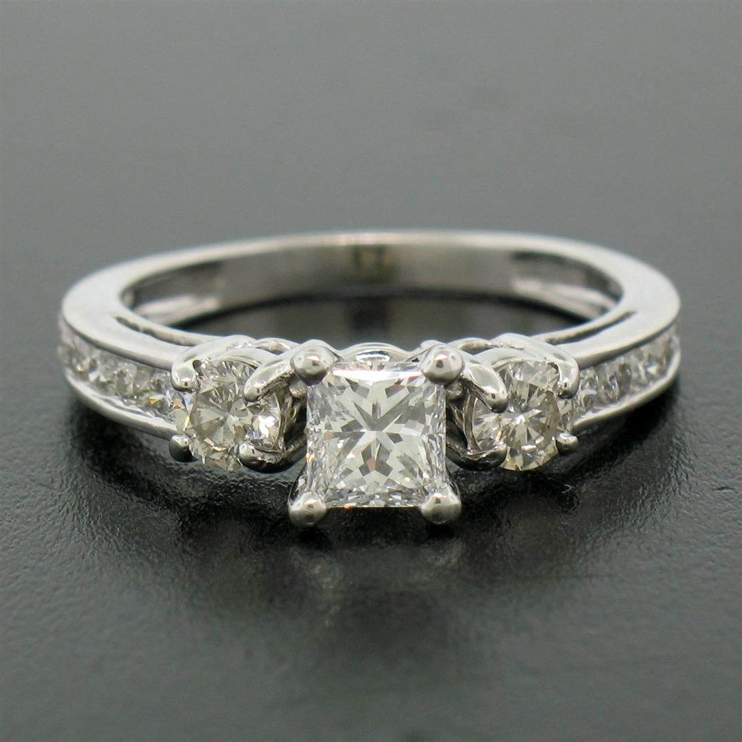 One 14k White Gold 1.10ctw Princess Diamond 3 Stone Engagement Ring w/ Round Accents. Item Details: Material: 14k White Gold, Weight: 2.5 Grams, Stone(s): (1) Natural Genuine Diamond - Princess Cut - Prong Set - G Color - VS2 Clarity - 0.45ct (approx.), (2) Natural Genuine Diamonds - Round Brilliant Cut - Prong Set - G Color - VS2 Clarity - 0.32ctw (approx.), (12) Natural Genuine Diamonds - Round Brilliant Cut - Channel Set - G Color - VS2 Clarity - 0.33ctw (approx.), Total Carat Weight: 1.10 (approx.), Ring Size: 5 (We can custom size this ring.), Ring Width: 5.40mm, Ring Height: 6.67mm rise off the finger, Condition: Like New!