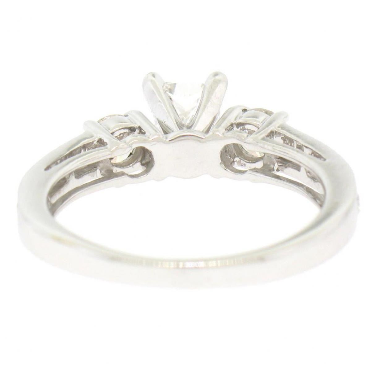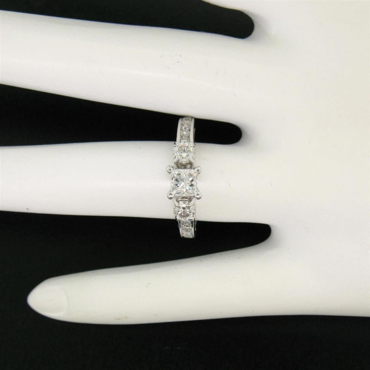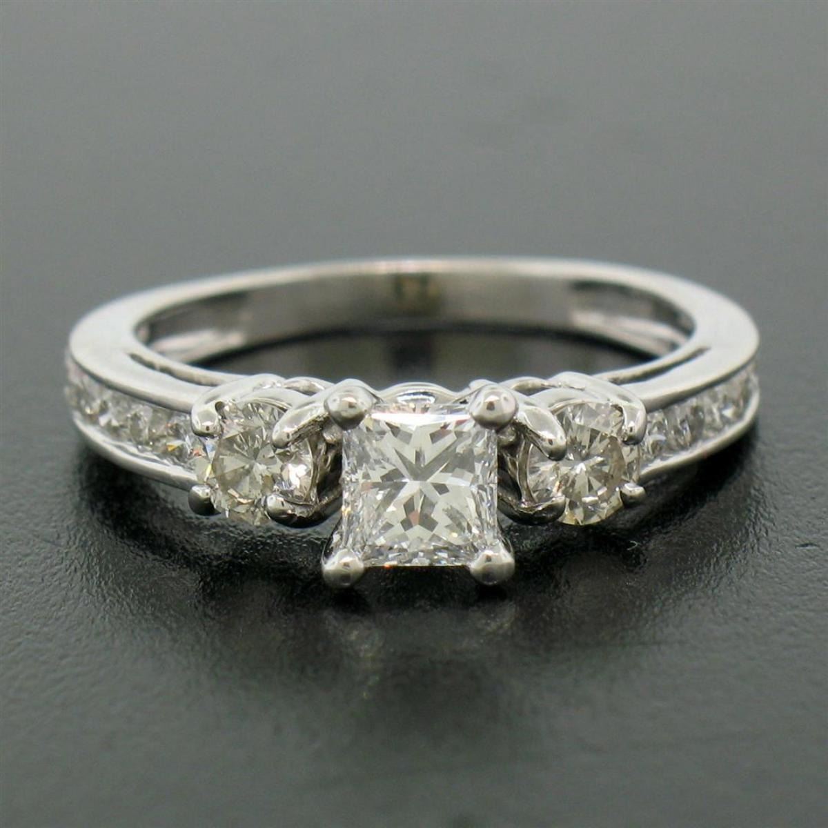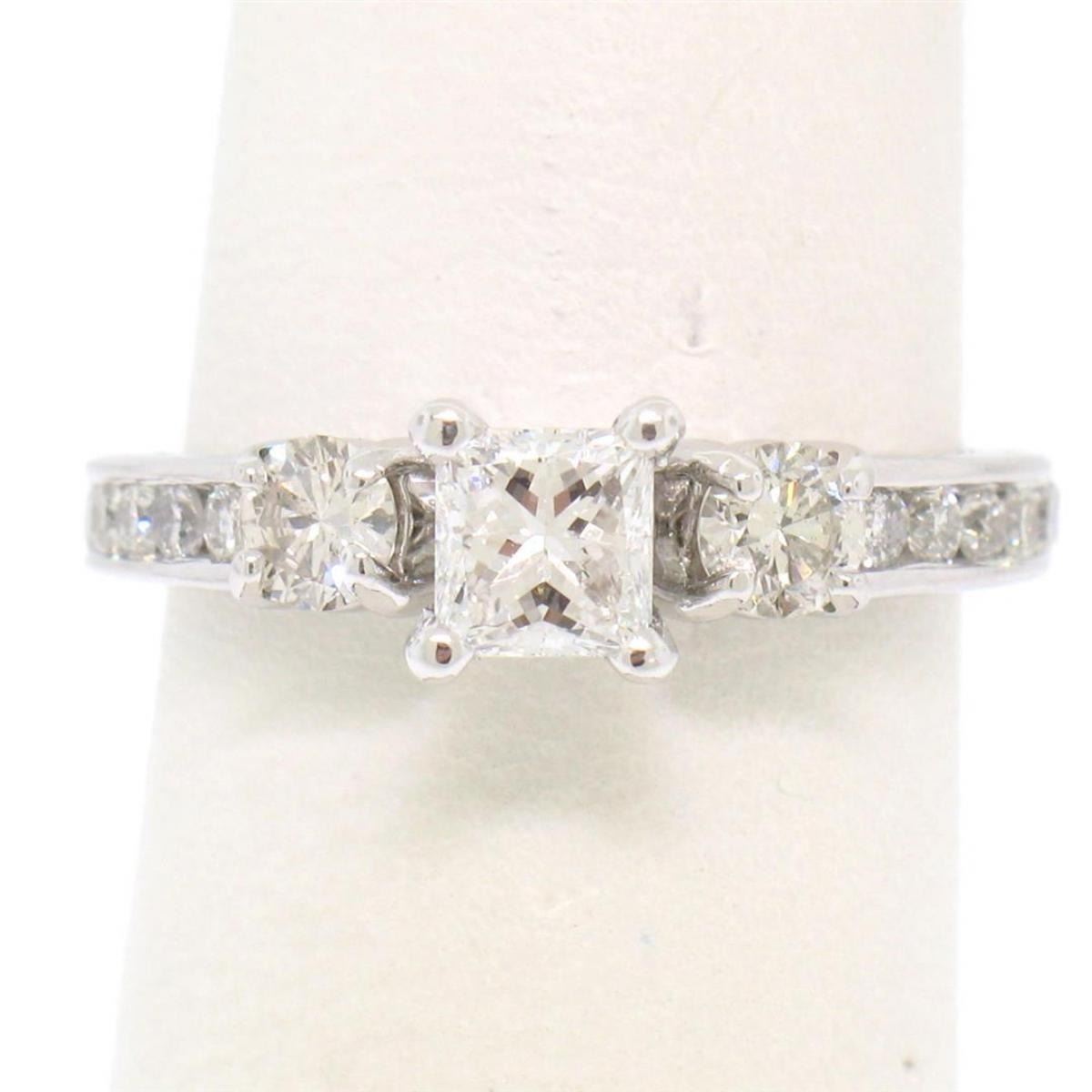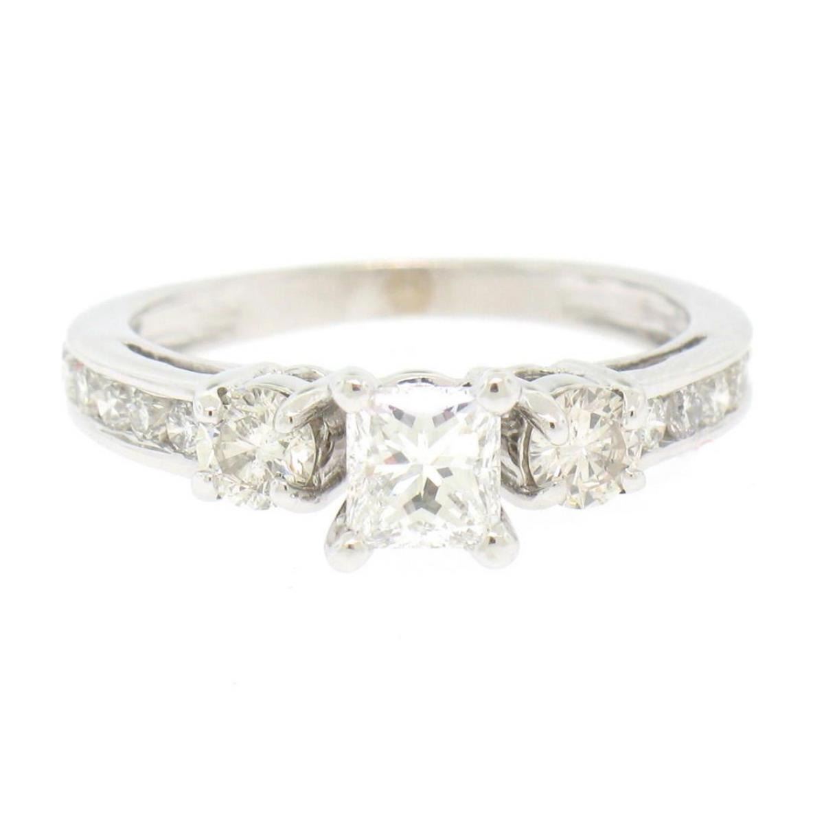 One 14k White Gold 1.10ctw Princess Diamond 3 Stone Engagement Ring w/ Round Accents. Item Details: Material: 14k White Gold, Weight: 2.5 Grams, Stone(s): (1) Natural Genuine Diamond - Princess Cut - Prong Set - G Color - VS2 Clarity - 0.45ct (approx.), (2) Natural Genuine Diamonds - Round Brilliant Cut - Prong Set - G Color - VS2 Clarity - 0.32ctw (approx.), (12) Natural Genuine Diamonds - Round Brilliant Cut - Channel Set - G Color - VS2 Clarity - 0.33ctw (approx.), Total Carat Weight: 1.10 (approx.), Ring Size: 5 (We can custom size this ring.), Ring Width: 5.40mm, Ring Height: 6.67mm rise off the finger, Condition: Like New!