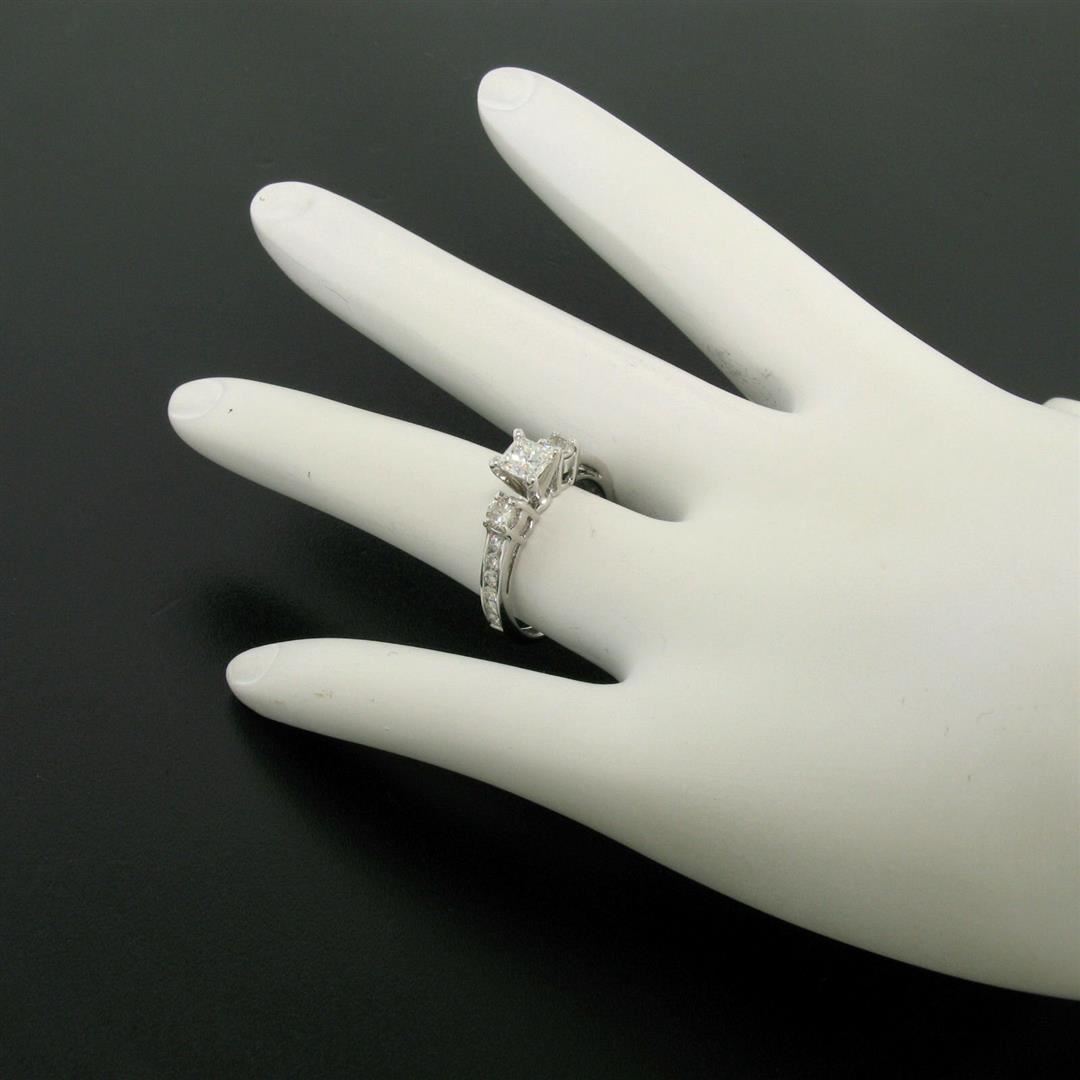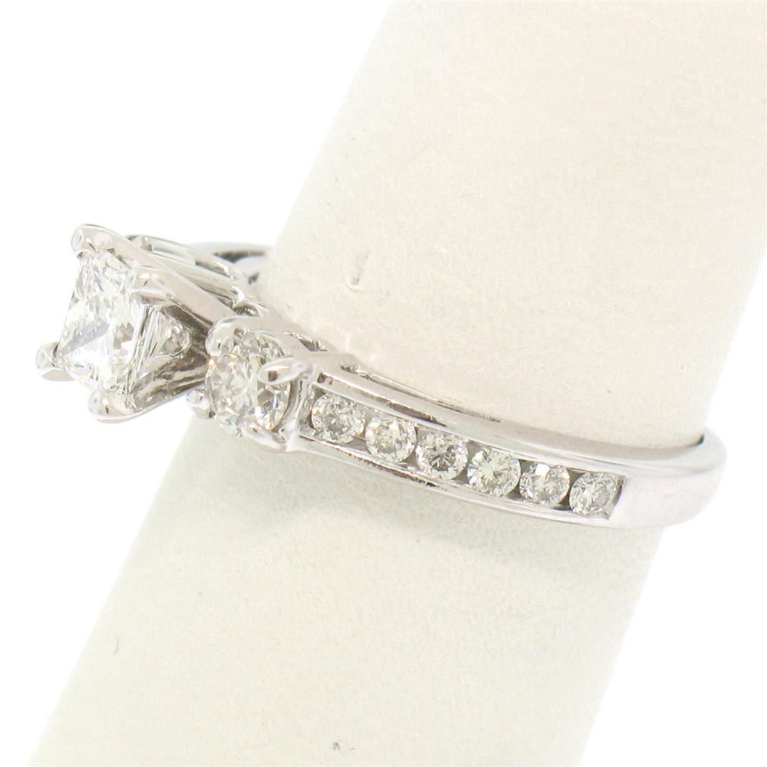 One 14k White Gold 1.10ctw Princess Diamond 3 Stone Engagement Ring w/ Round Accents. Item Details: Material: 14k White Gold, Weight: 2.5 Grams, Stone(s): (1) Natural Genuine Diamond - Princess Cut - Prong Set - G Color - VS2 Clarity - 0.45ct (approx.), (2) Natural Genuine Diamonds - Round Brilliant Cut - Prong Set - G Color - VS2 Clarity - 0.32ctw (approx.), (12) Natural Genuine Diamonds - Round Brilliant Cut - Channel Set - G Color - VS2 Clarity - 0.33ctw (approx.), Total Carat Weight: 1.10 (approx.), Ring Size: 5 (We can custom size this ring.), Ring Width: 5.40mm, Ring Height: 6.67mm rise off the finger, Condition: Like New!