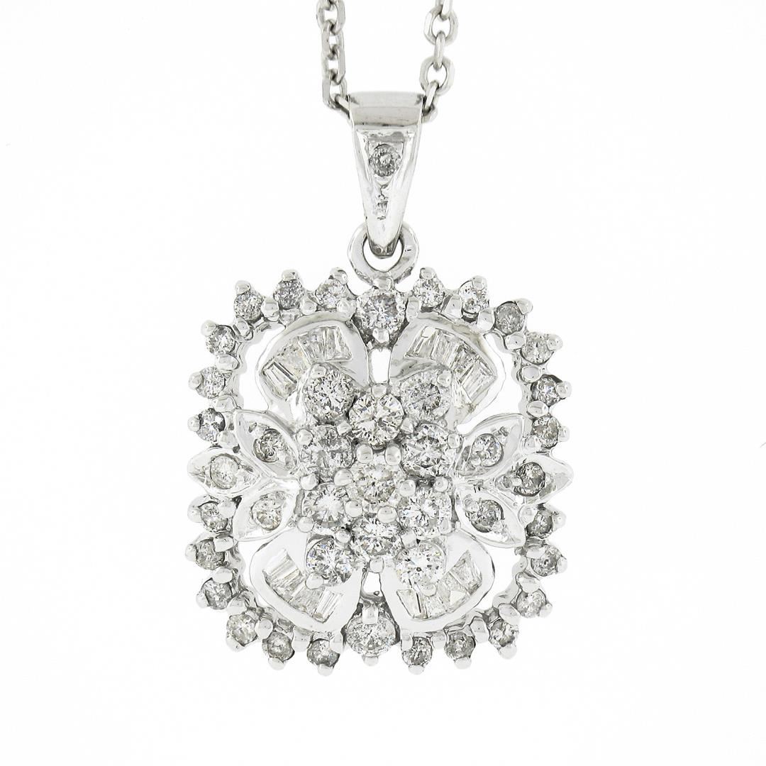 A solid 14k white gold pendant necklace, with 44 round brilliant cut natural diamonds (G/H - I2/I3 ; 0.80ct), and 16 baguette cut natural diamonds (G/H - I1-I3 ;0.30ctw). 18 inch cable link chain, 6.46 grams total weight, pendant measures 26.2x17.4mm.