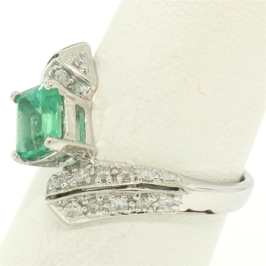 One 14k White Gold 1.20ctw Colombian Emerald & Pave Diamond Bypass Cocktail Ring. Item Details - Material: 14k Solid White Gold, Weight: 3.50 Grams, Stone(s): (1) Natural Genuine Colombian Emerald - Emerald Cut - Prong Set - Green Color - 0.80ct (approx.), (24) Natural Genuine Diamonds - Round Cut - Pave Set - G/H Color - SI2/I1 Clarity - 0.40ctw (approx.), Total Carat Weight: 1.20 (approx.), Ring Size: 7.0, Ring Width: 15mm, Ring Height: 6mm rise off the finger, Condition: Like New!