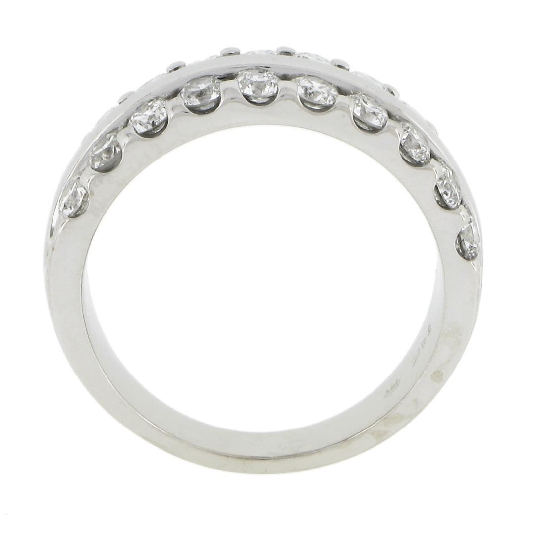 A solid 14k white gold band ring, with 20 round cur natural diamonds (G/H - SI1/SI2 w/ a few I1 ; 1.20ctw). The ring is size 7.0, weighs a total of 6.78 grams, and measures 7.7mm wide.