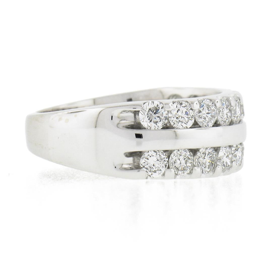 A solid 14k white gold band ring, with 20 round cur natural diamonds (G/H - SI1/SI2 w/ a few I1 ; 1.20ctw). The ring is size 7.0, weighs a total of 6.78 grams, and measures 7.7mm wide.