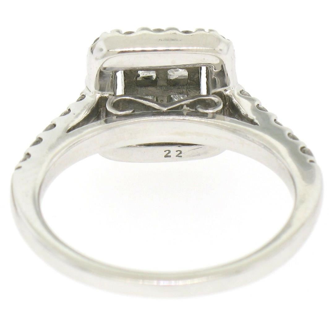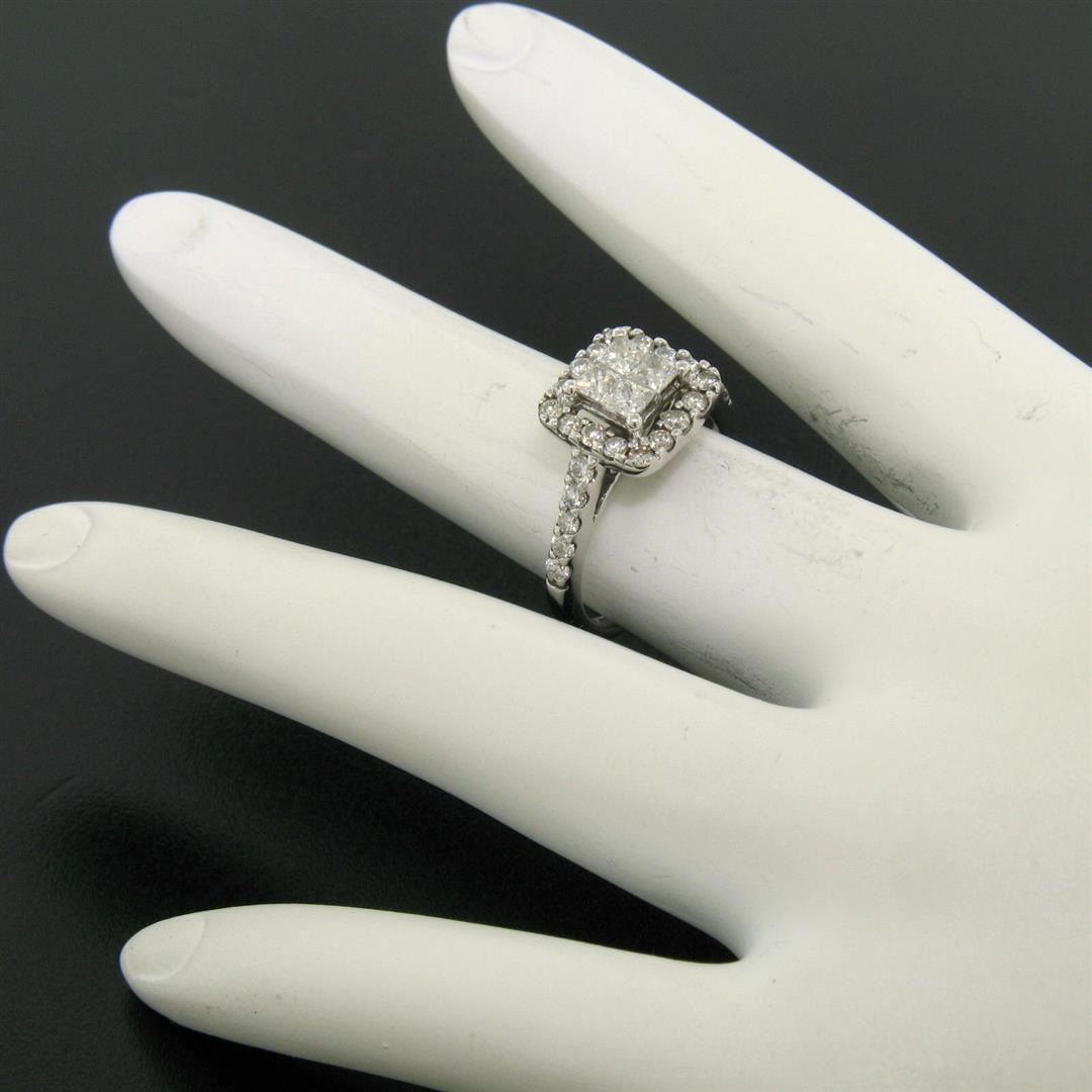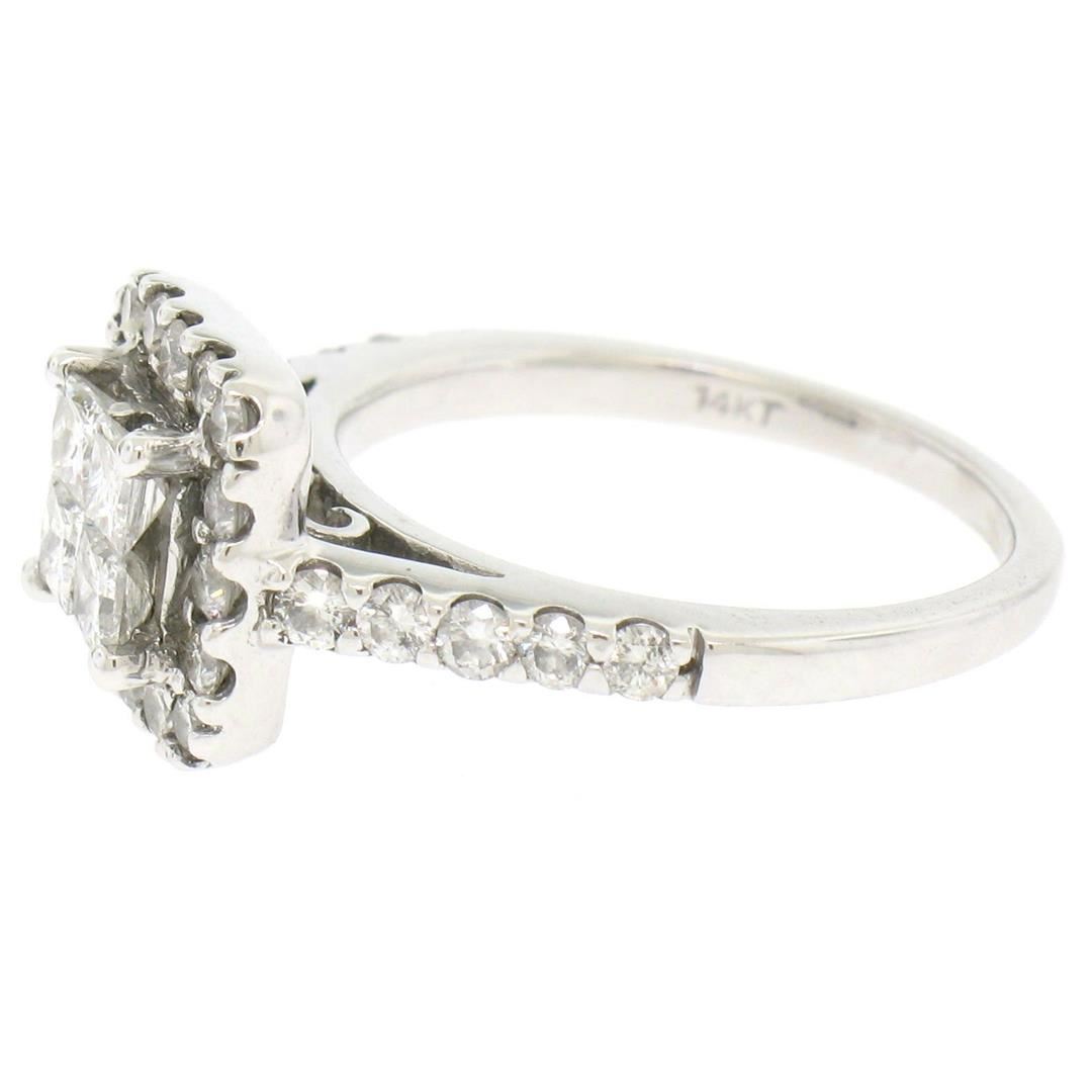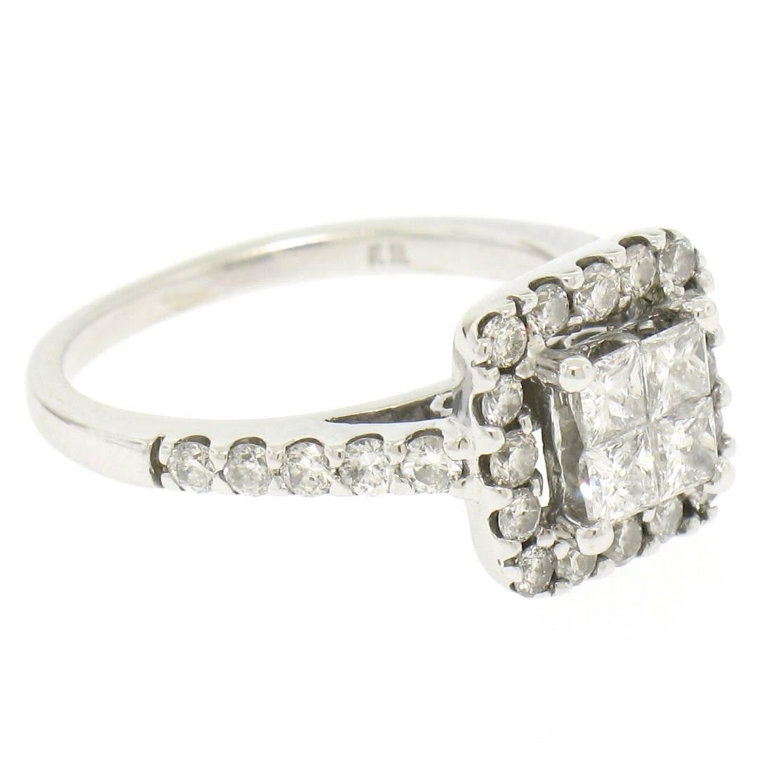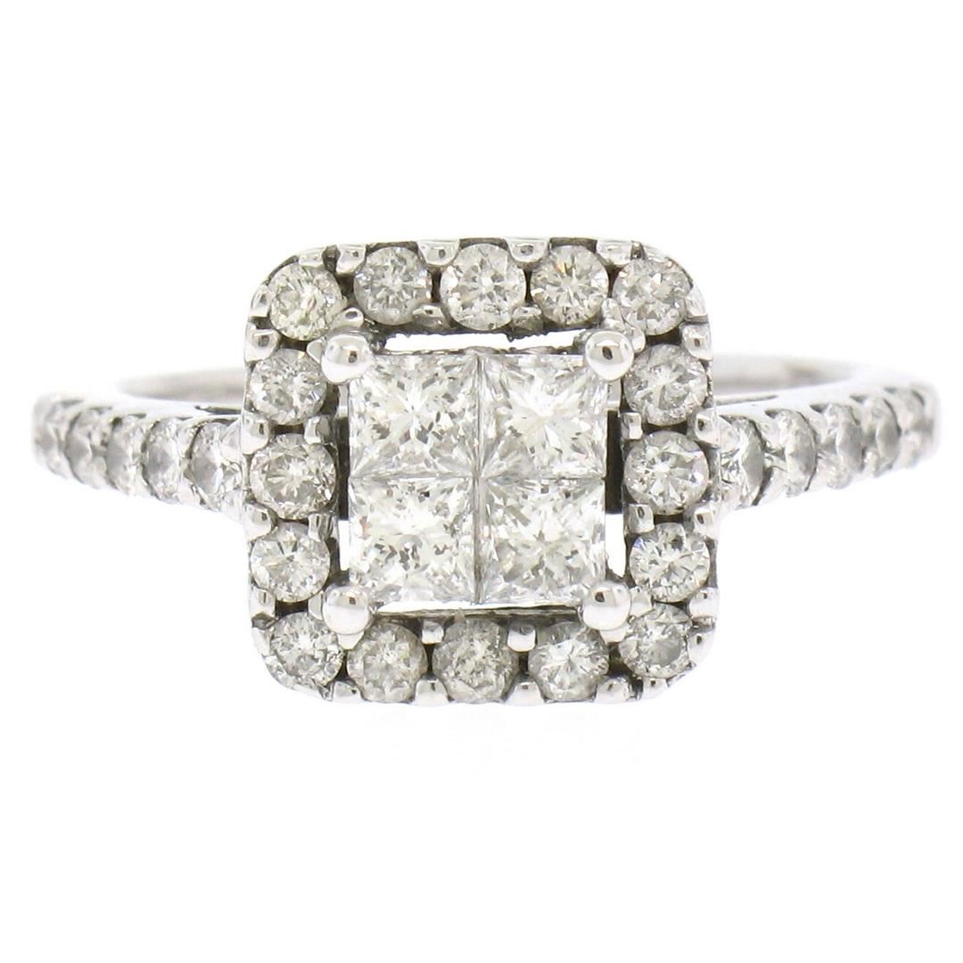 One 14k White Gold 1.25ctw 4 Invisible Princess & Round Diamond Halo Engagement Ring. Item Details: Material: 14K Solid White Gold, Weight: 3.77 Grams, Stone(s): (4) Natural Genuine Diamonds - Princess Cut - Invisible Set - G/H Color - SI1 Clarity - 0.50ctw (approx.), (26) Natural Genuine Diamonds - Round Brilliant Cut - Shared Prong Set - G/H Color - SI1 Clarity - 0.75ctw (approx.), Total Carat Weight: 1.25 (approx.), Ring Size: 5.0, Ring Width: 9.85mm, Ring Height: 6.97mm rise off the finger. Condition: Like New!