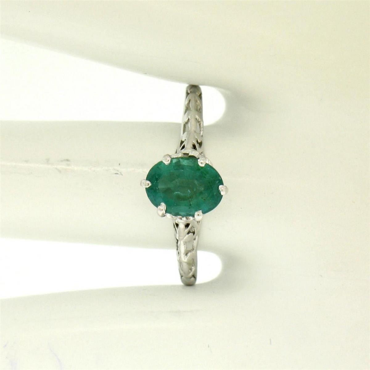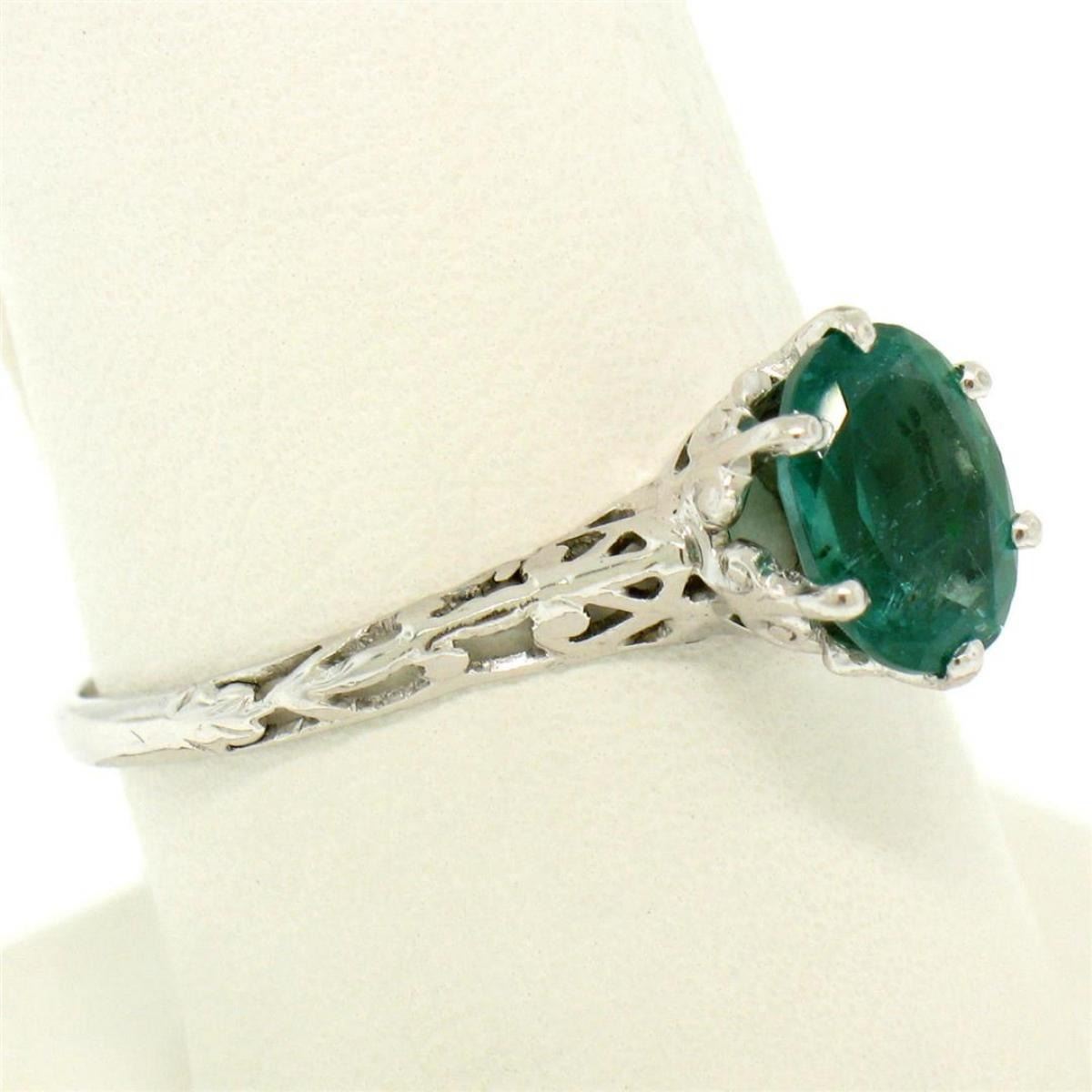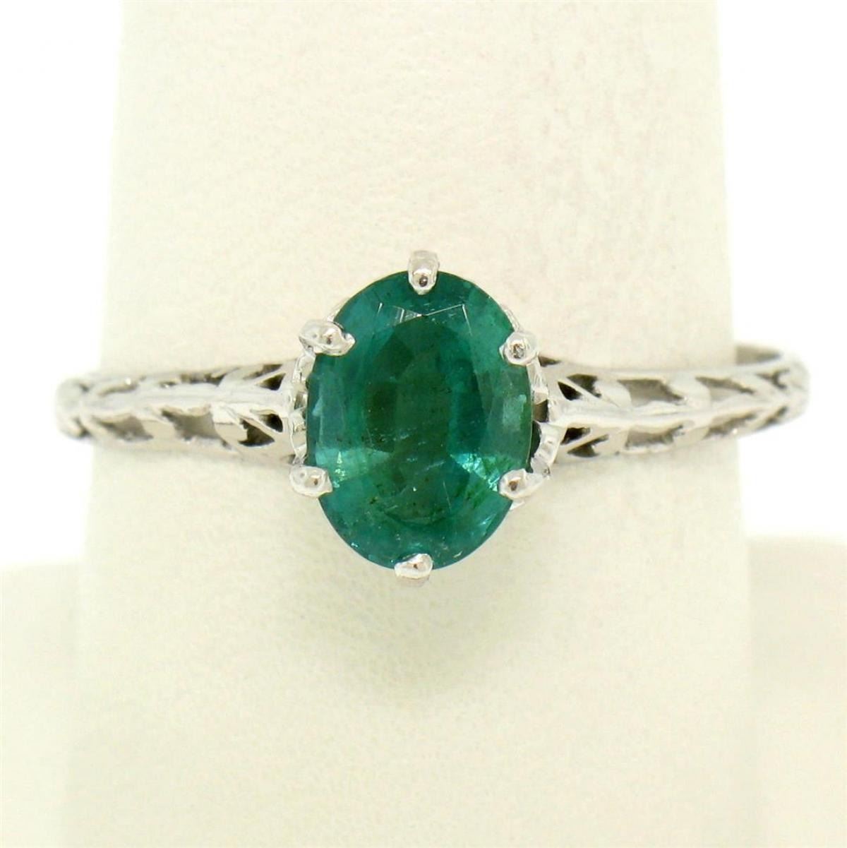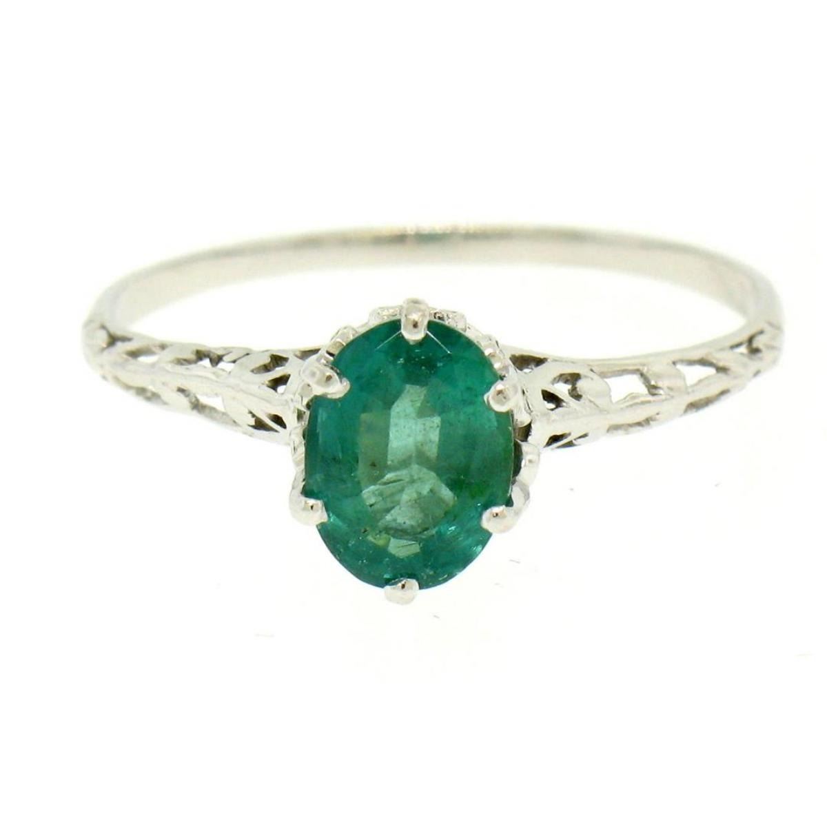One Vintage 14k White Gold 1.38ct Prong Set Oval Cut Emerald Filigree Solitaire Ring. Item Details: Material: 14k Solid White Gold, Weight: 3.1 Grams, Stone(s): (1) Natural Genuine Emerald - Oval Cut - Prong Set - Rich Icy Green Color - 1.38ct (approx.), Total Carat Weight: 1.38 (approx.), Ring Size: 10.5 (We can custom size this ring.), Ring Width: 9.15mm, Ring Height: 7.30mm rise off the finger, Condition: Vintage estate piece. Excellent condition!