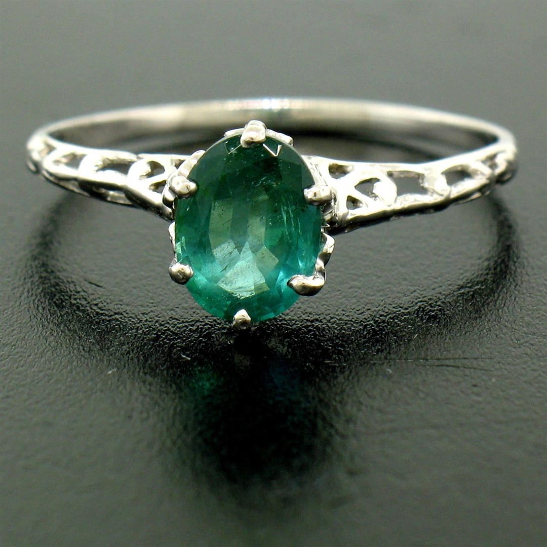 One Vintage 14k White Gold 1.38ct Prong Set Oval Cut Emerald Filigree Solitaire Ring. Item Details: Material: 14k Solid White Gold, Weight: 3.1 Grams, Stone(s): (1) Natural Genuine Emerald - Oval Cut - Prong Set - Rich Icy Green Color - 1.38ct (approx.), Total Carat Weight: 1.38 (approx.), Ring Size: 10.5 (We can custom size this ring.), Ring Width: 9.15mm, Ring Height: 7.30mm rise off the finger, Condition: Vintage estate piece. Excellent condition!