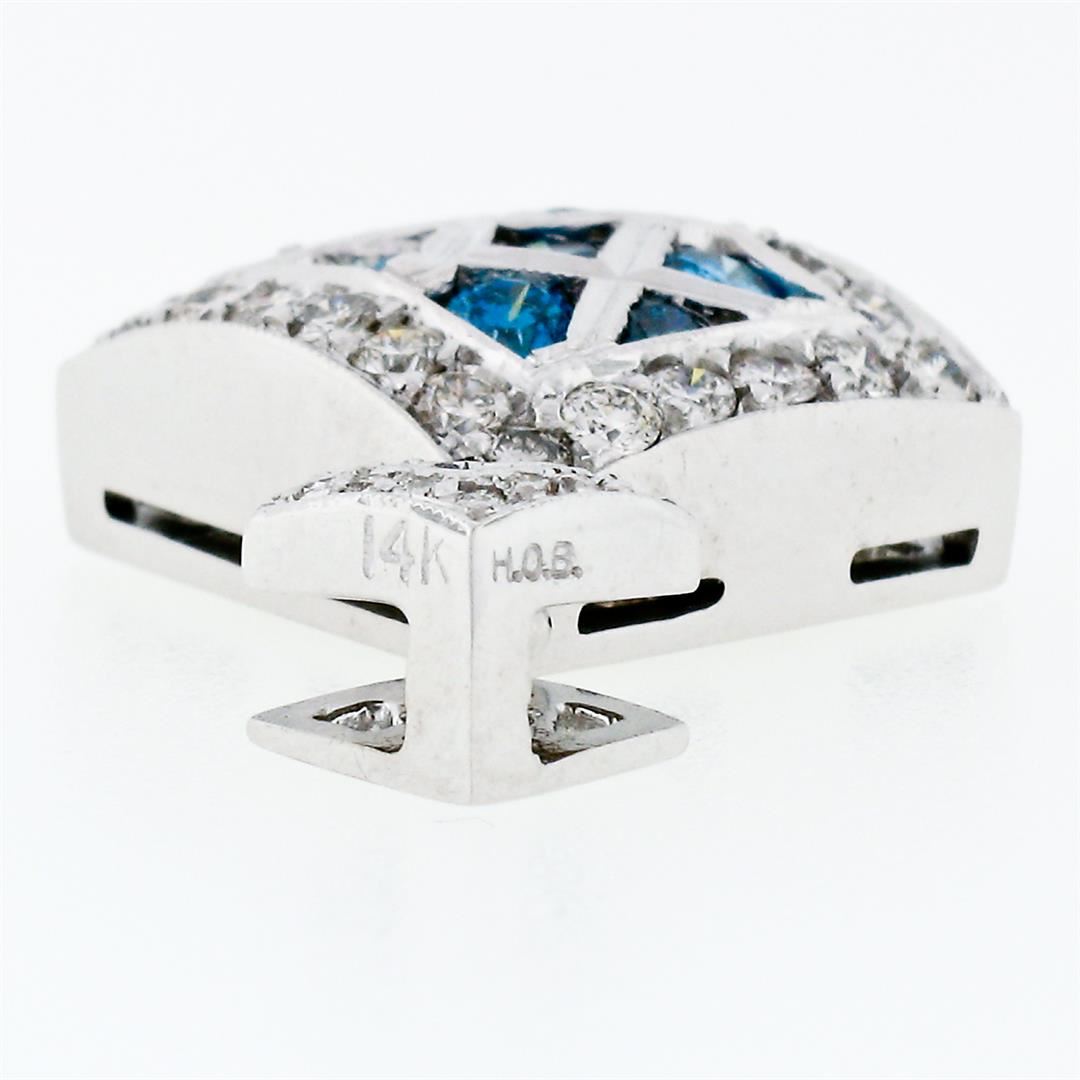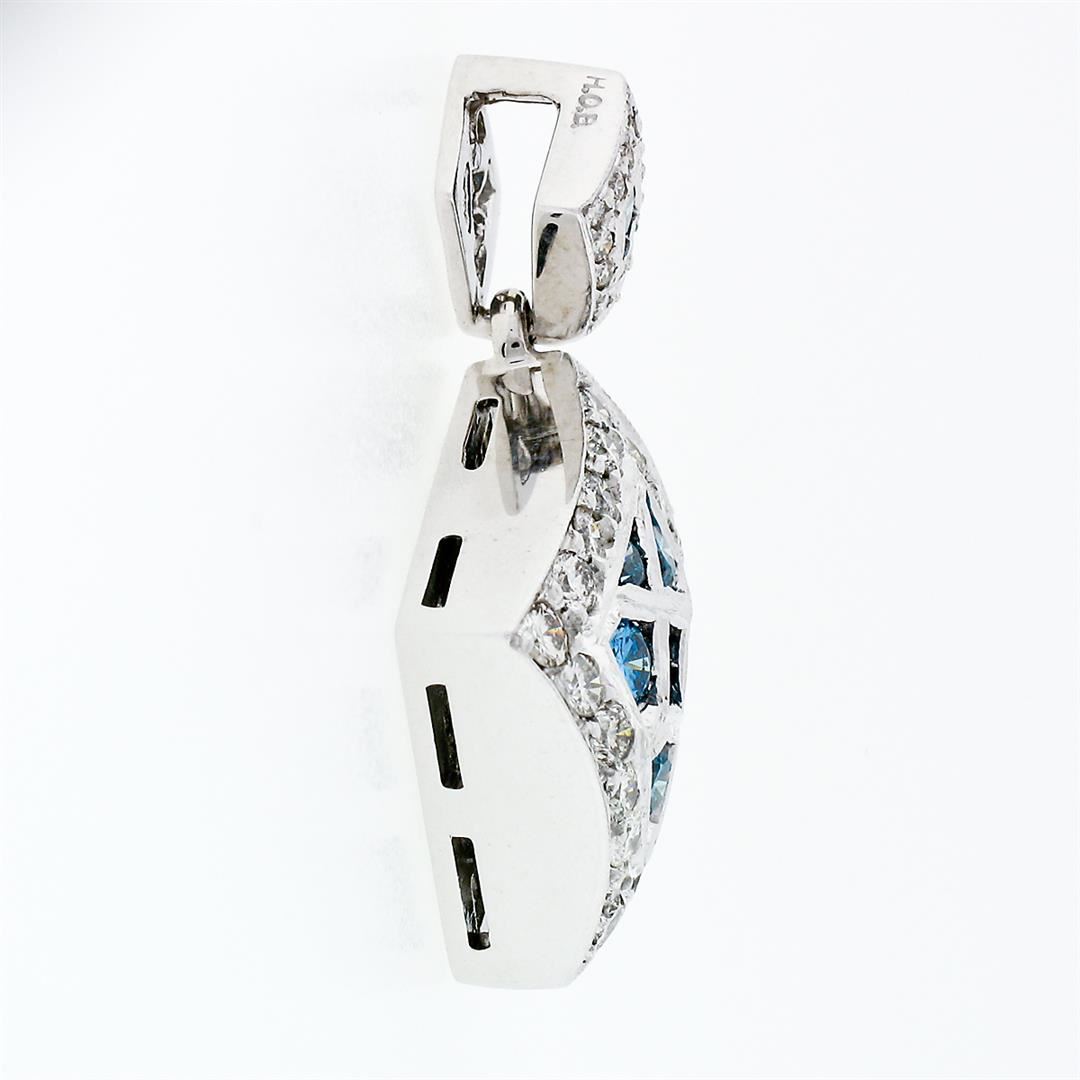 A solid 14k white gold square dangle pendant, with 8 round brilliant cut natural diamonds (Fancy Vivid Blue Color - VS1/VS2 ; 0.60ctw), and 34 round brilliant cut natural diamonds (F/G - VS1/VS2 ; 0.82ctw). The pendant weighs a total of 5.73 grams, measures 15.85x14.30mm including the bail, and the inside of the bail measures 5.2x2.2mm.
