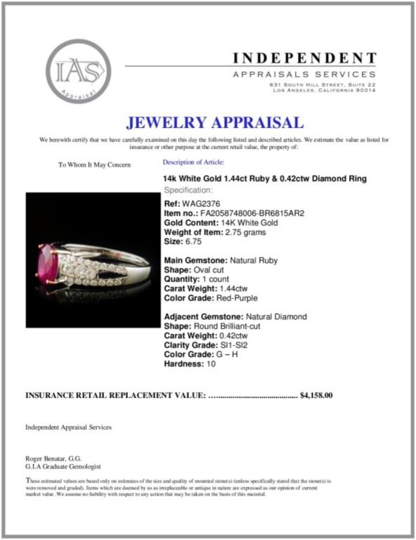 Regarding Appraised Jewelry and Loose Stones - Auctionfarm sends them out to a third party for Retail Replacement Value Appraisals, which are the most common. These types of evaluations are written for insurance needs. This would be the cost to replace the jewelry with an item of equal quality and kind, considered to be the current market price or the replacement value. This type of appraisal is done to protect you in the event of damage or loss of a valuable item. Our appraisals are conducted by independent 3rd Party appraisal firms that utilizes Certified GIA Gemologist. Appraisals should be used for verification of gemstone and/or metal weight, size, and grade only, not actual value. Appraisal value should be considered for insurance purposes only, not actual value, as price varies greatly from retail locations thru out the world. Items should not be purchased with the expectation to resell for appraisal price, or for profit.