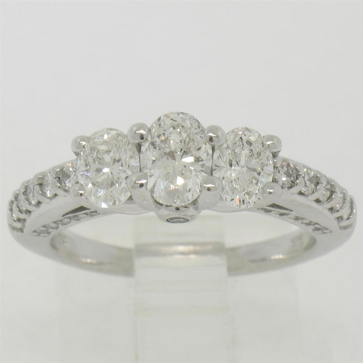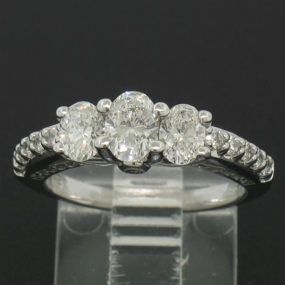 A 14k white gold 3 stone ring featuring a larger oval cut natural diamond (H - SI1; 0.65ct) prong set at the center of 2 smaller oval cut natural diamonds (H - SI1/SI2; 0.54ctw) and accented by an additional 32 round brilliant cut natural diamonds (H/I - SI1/SI2; 0.31ctw) pave and bezel set throughout its top. The ring is size 6.0, weighs a total of 4.97 grams, and measures 6.0mm wide.