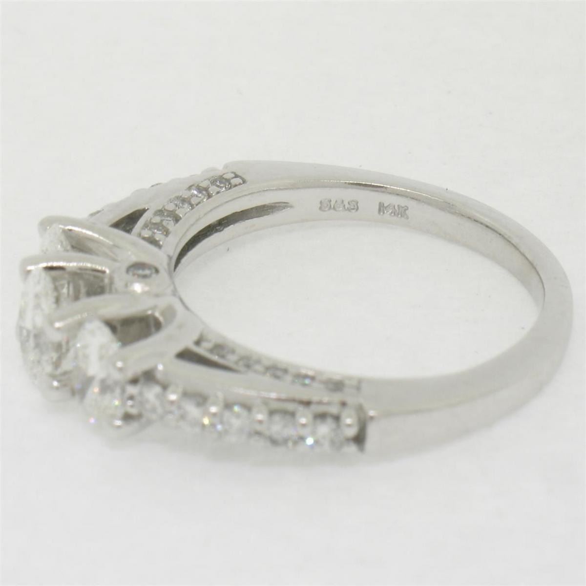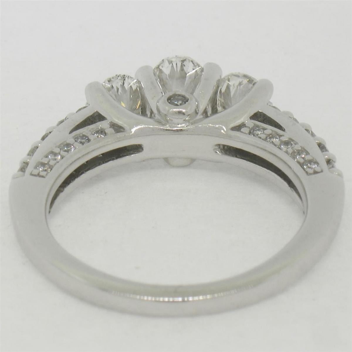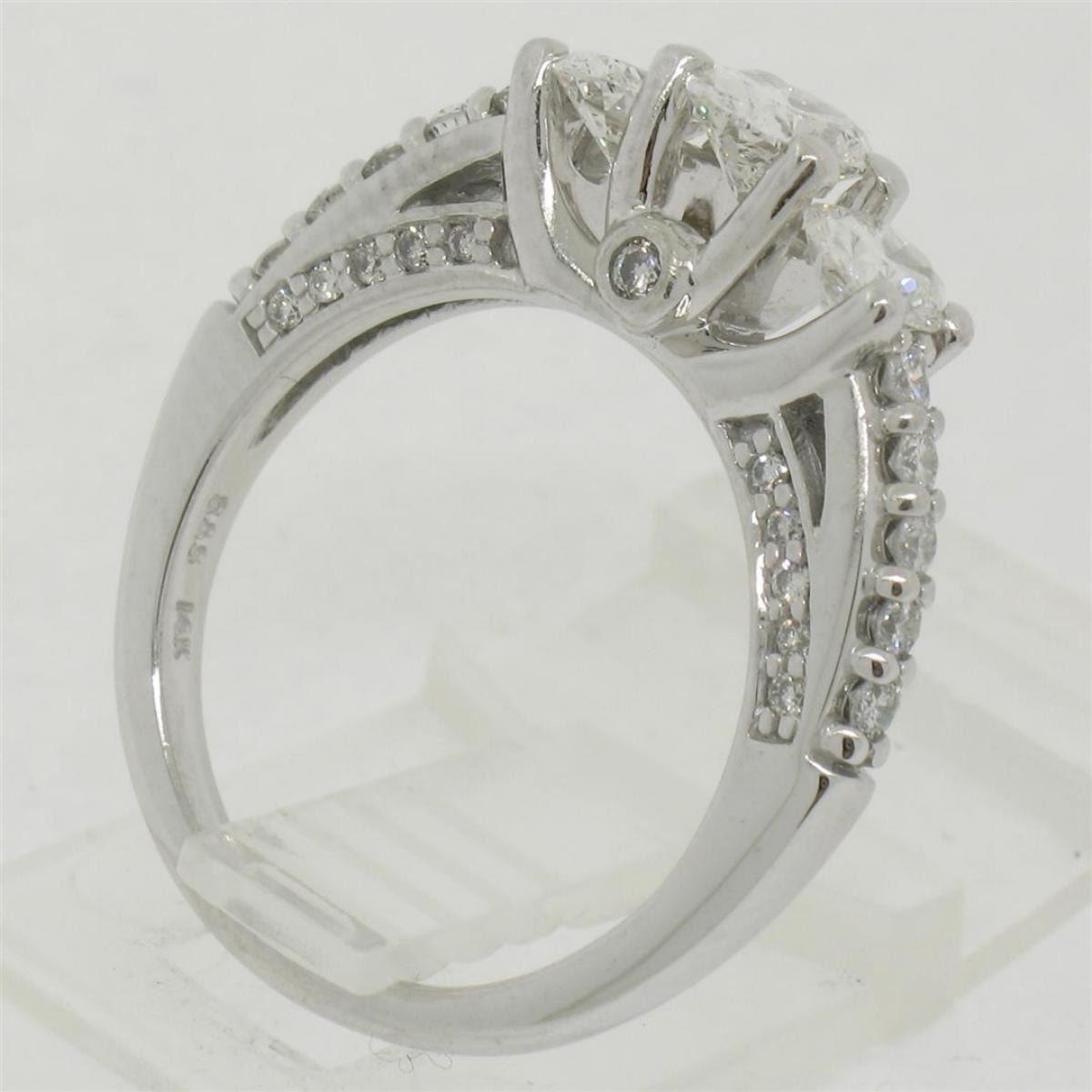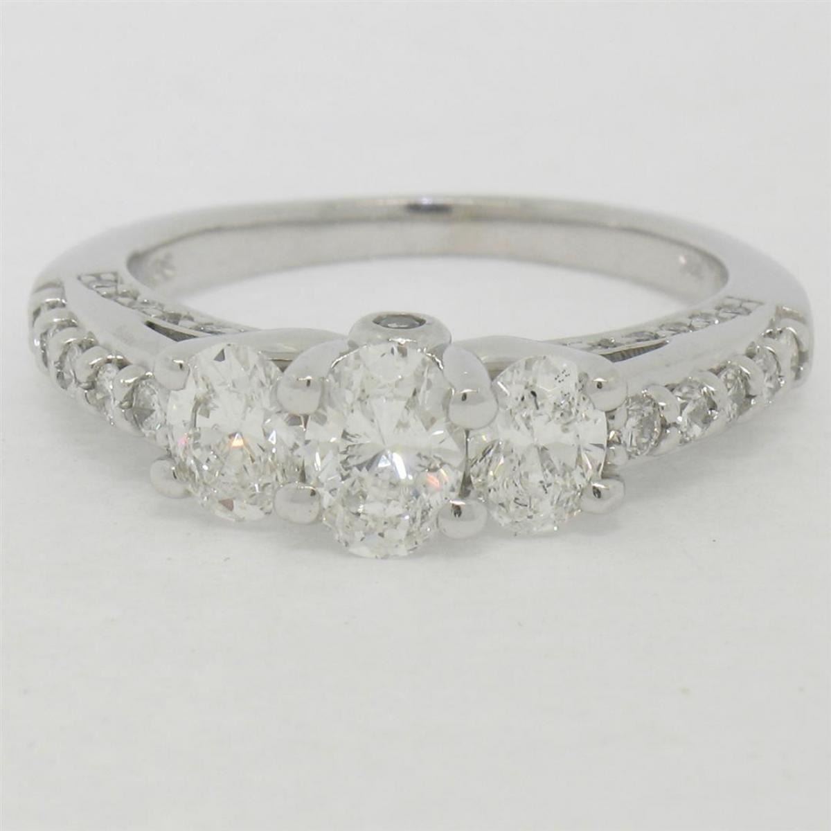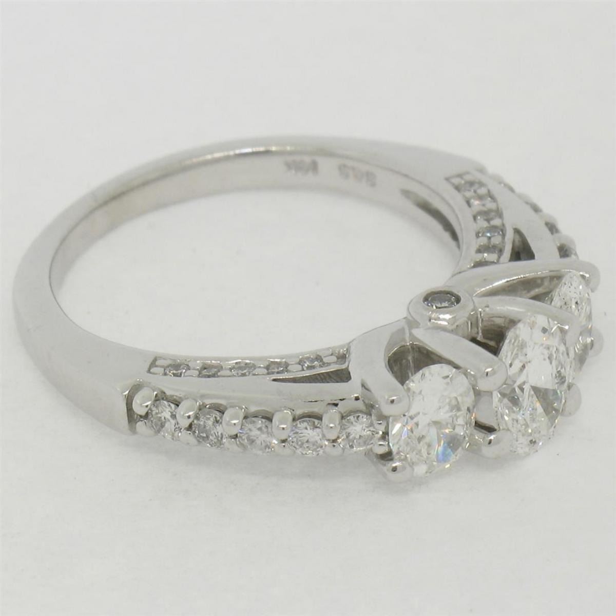 A 14k white gold 3 stone ring featuring a larger oval cut natural diamond (H - SI1; 0.65ct) prong set at the center of 2 smaller oval cut natural diamonds (H - SI1/SI2; 0.54ctw) and accented by an additional 32 round brilliant cut natural diamonds (H/I - SI1/SI2; 0.31ctw) pave and bezel set throughout its top. The ring is size 6.0, weighs a total of 4.97 grams, and measures 6.0mm wide.
