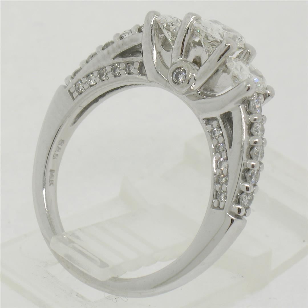 An estate solid 14k white gold ring, with 3 oval cut natural diamonds (H- SI1/SI2; 1.19ctw), accented with 32 round brilliant cut natural diamond (H/I- SI1/SI2; 0.31ctw). The ring is size 6.0, weighs a total of 4.97 grams, and measures 6.0mm wide.