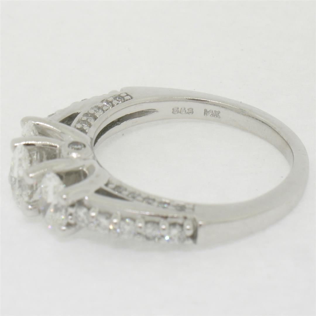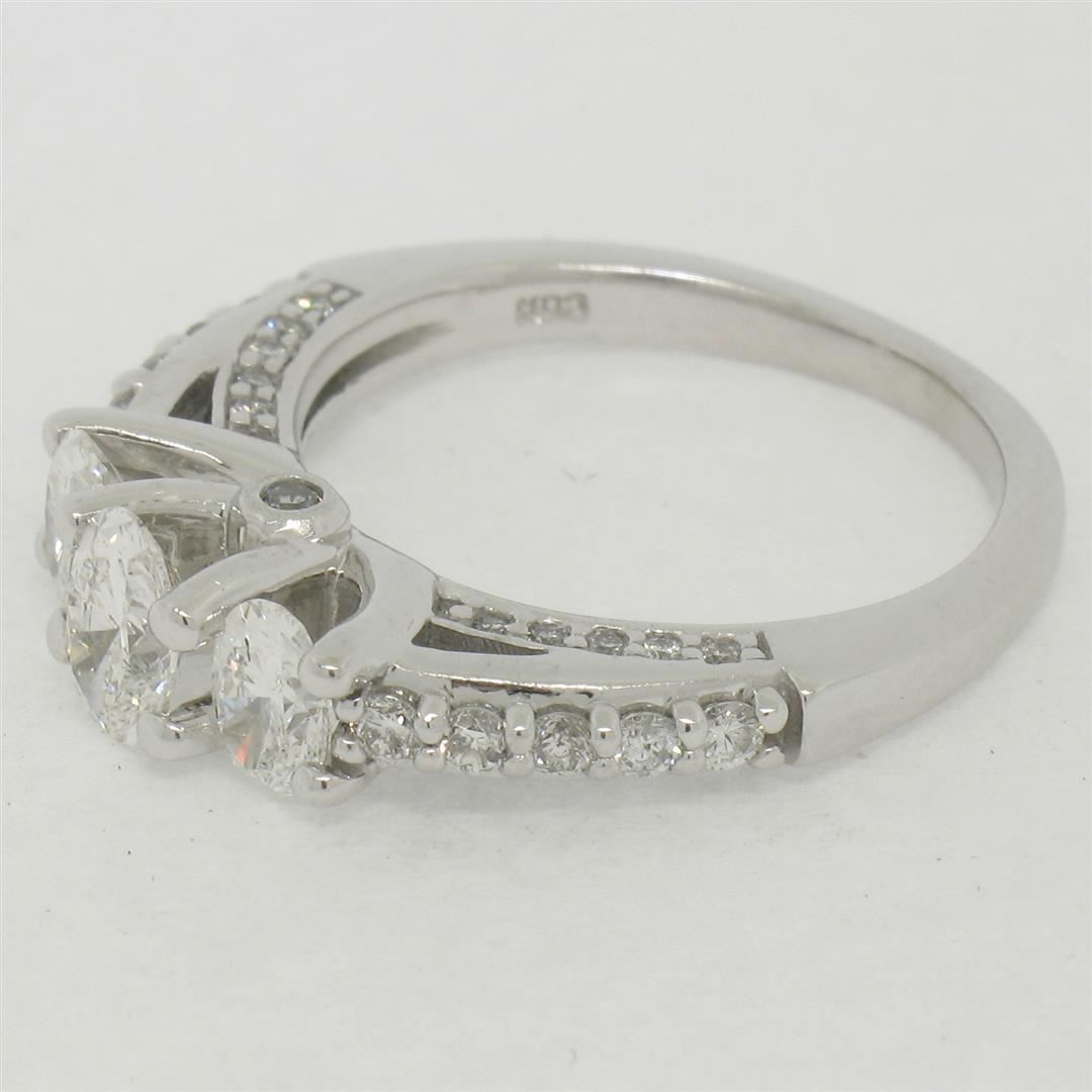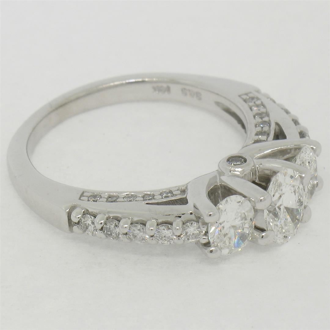 An estate solid 14k white gold ring, with 3 oval cut natural diamonds (H- SI1/SI2; 1.19ctw), accented with 32 round brilliant cut natural diamond (H/I- SI1/SI2; 0.31ctw). The ring is size 6.0, weighs a total of 4.97 grams, and measures 6.0mm wide.