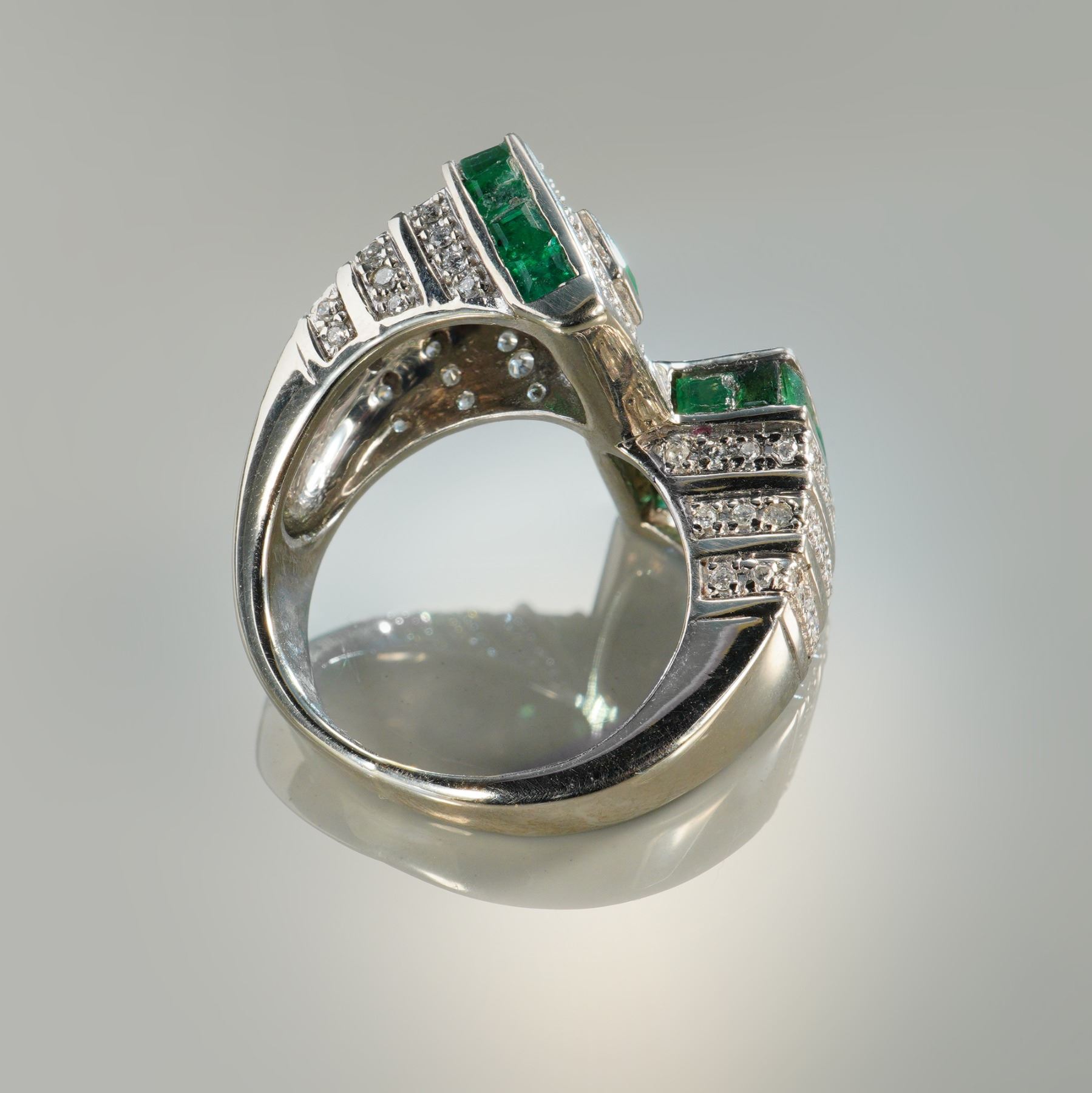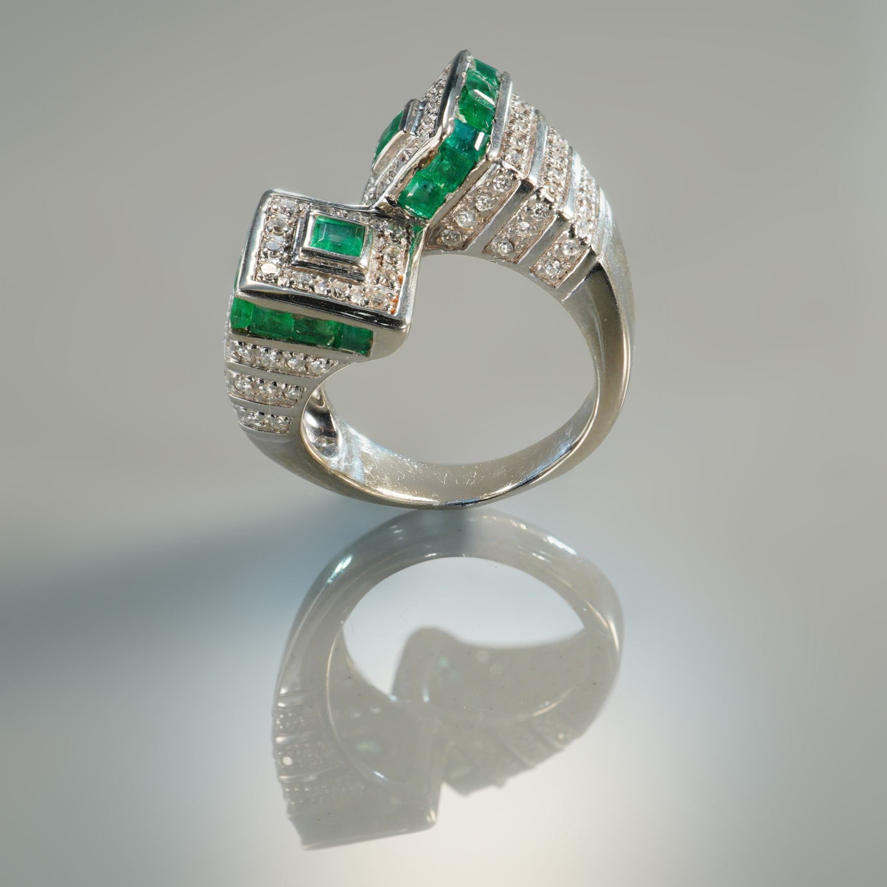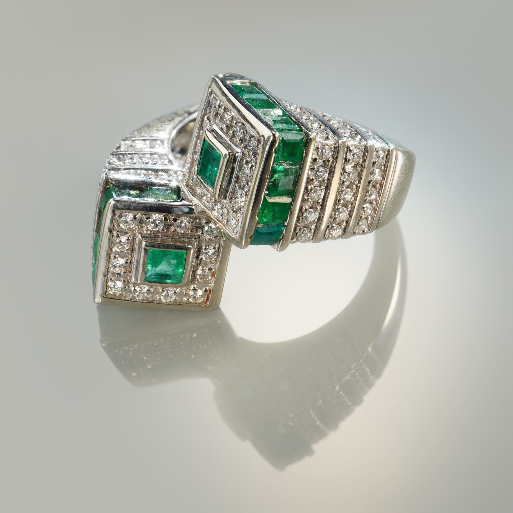 A bold 14k white gold bypass ring featuring twenty richly colored square cut emeralds totaling approximately 1.60 carats. Accenting the design are ninety round diamonds with a combined weight of about 0.90 carat, graded F color and VS1 clarity. The architectural stepped setting showcases the emeralds in geometric channels framed by sparkling diamonds, while the bypass form adds a dynamic sense of movement and sophistication. Combined emerald and diamond weight is approximately 2.50 carats. The ring itself weighs 10.86g.