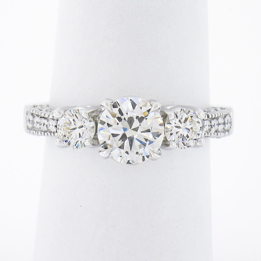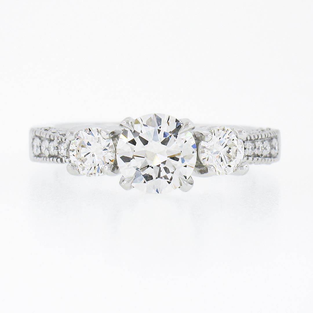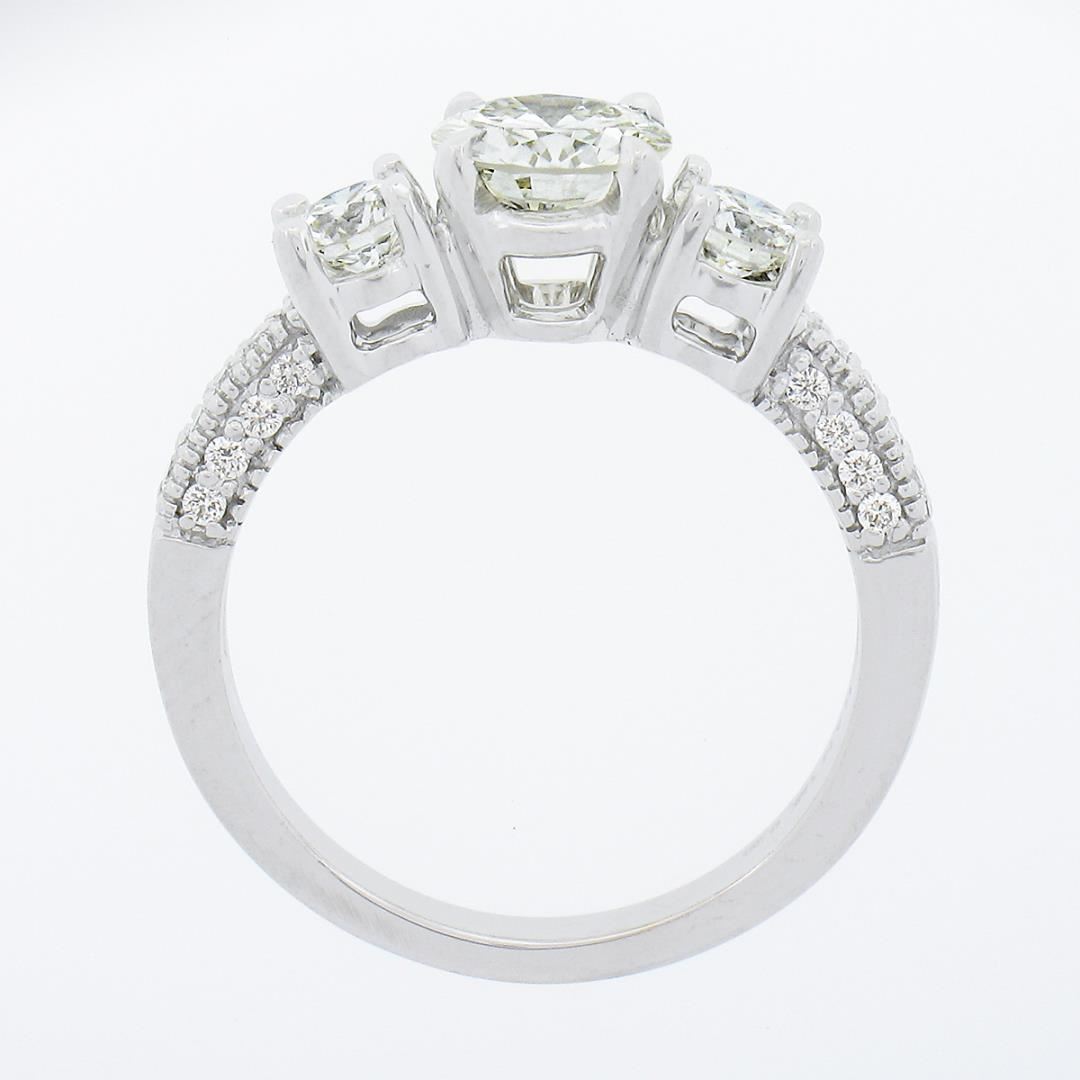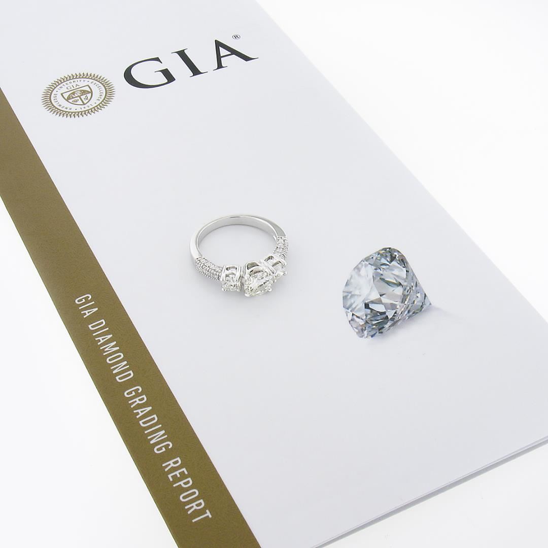 A solid 14k white gold engagement ring, with 1 GIA graded round cut natural diamond (J - VVS2 ; 1.00ct), and 16 round cut natural diamonds (H/I - VS1/VS2 ; 0.70ctw). The ring is size 6.0, weighs a total of 4.43 grams, and measures 6.6mm wide. Comes with all original relevant certifications.