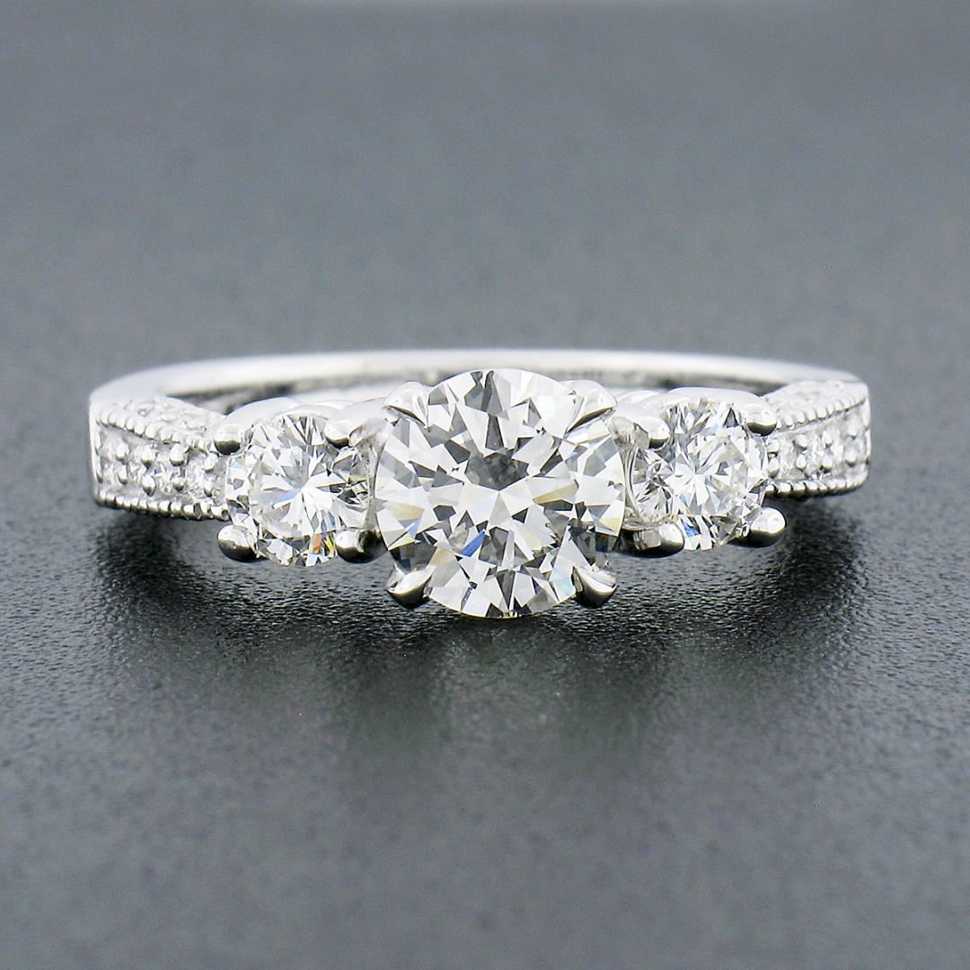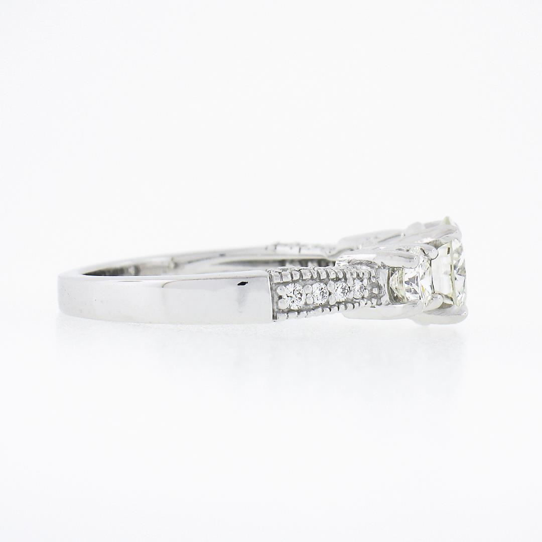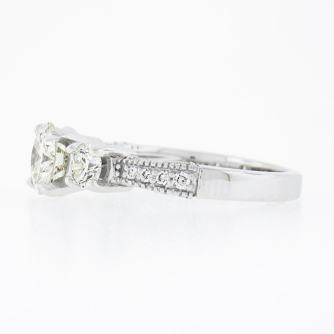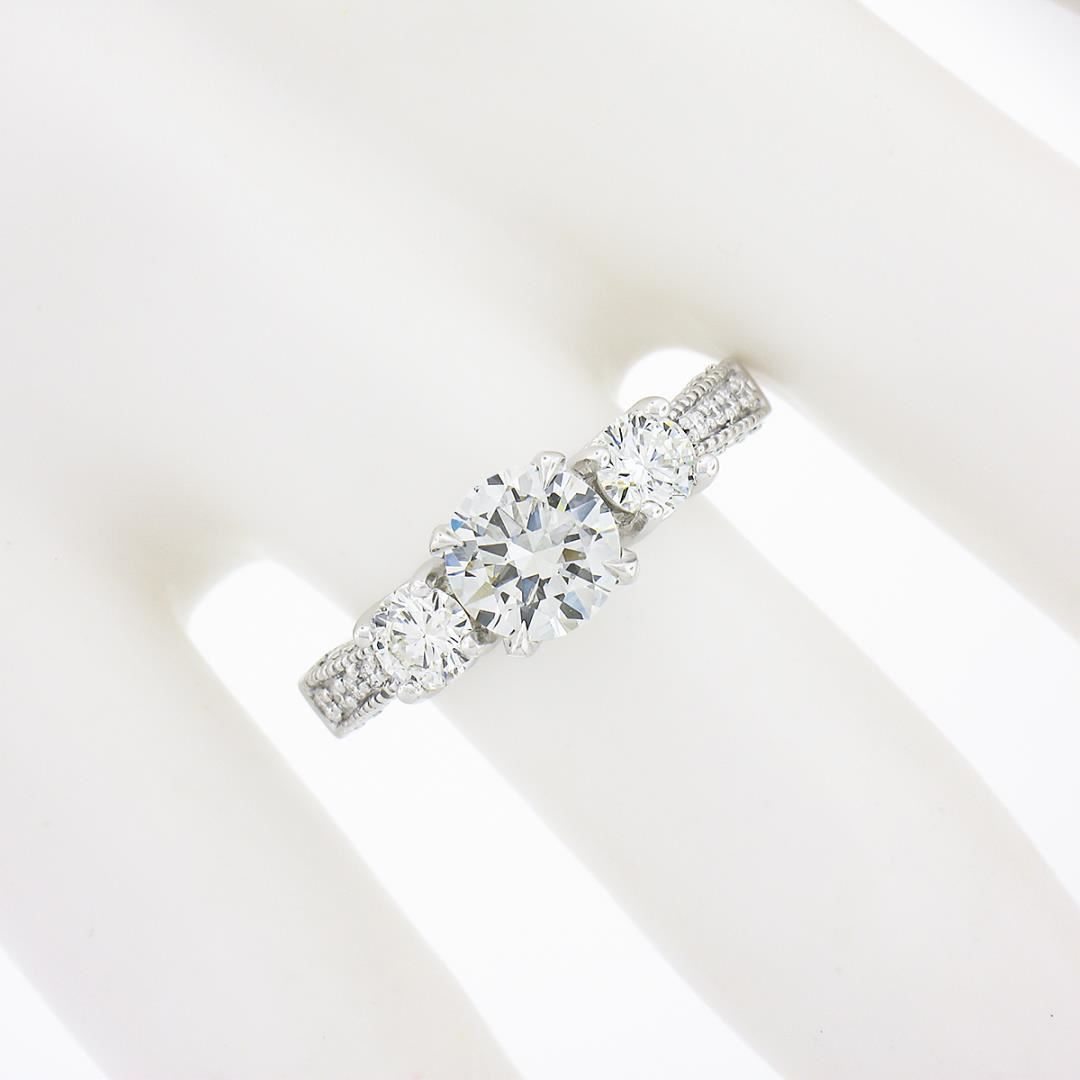 A solid 14k white gold engagement ring, with 1 GIA graded round cut natural diamond (J - VVS2 ; 1.00ct), and 16 round cut natural diamonds (H/I - VS1/VS2 ; 0.70ctw). The ring is size 6.0, weighs a total of 4.43 grams, and measures 6.6mm wide. Comes with all original relevant certifications.