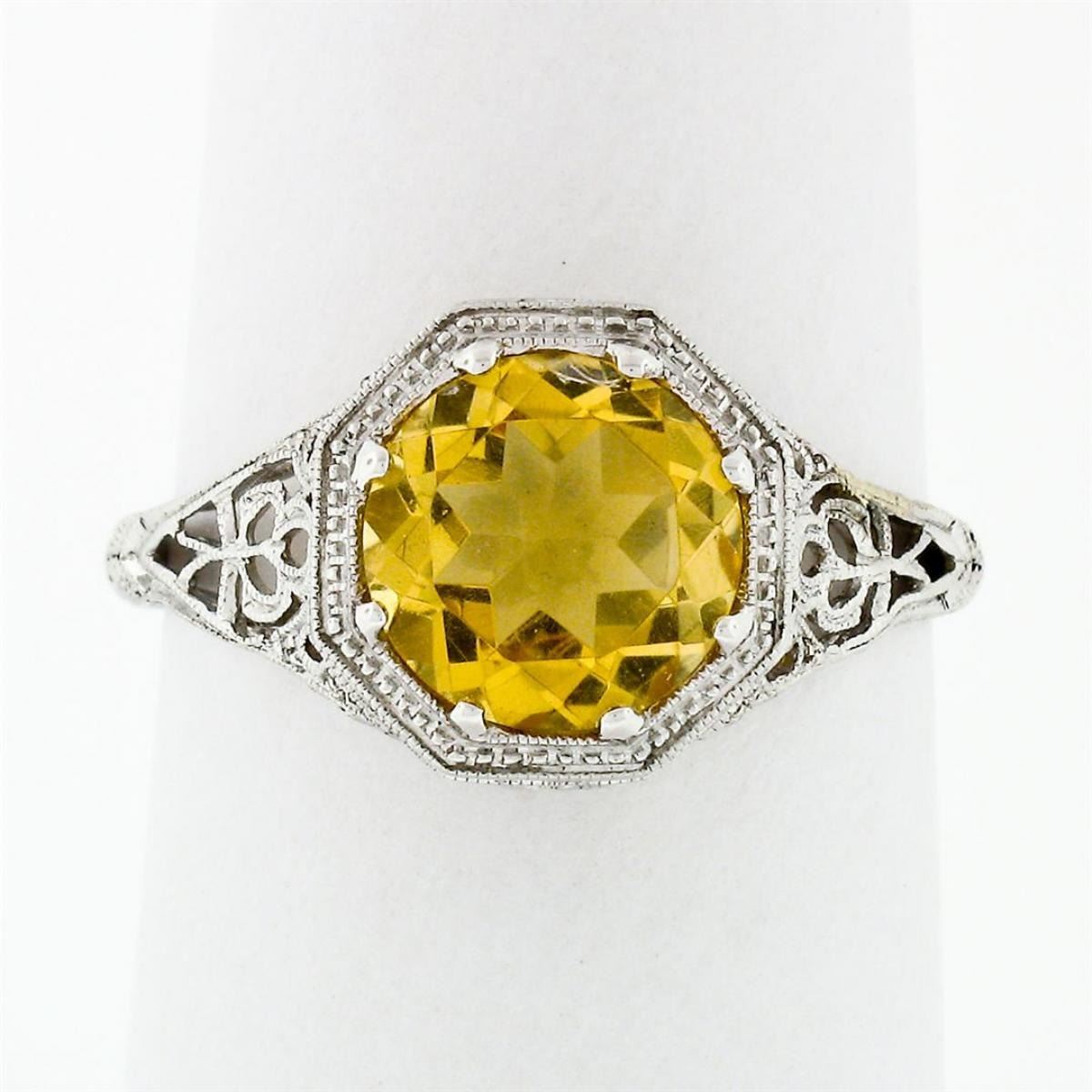14k White Gold 1.80ct Fine Filigree & Milgrain Work Citrine Solitaire Ring. A brand new solid 14k white gold ring featuring a round brilliant cut natural citrine (8.1mm; 1.80ct) and fine floral open filigree work. The ring is size 6.5, weighs a total of 2.20 grams, and measures 10.47mm wide.