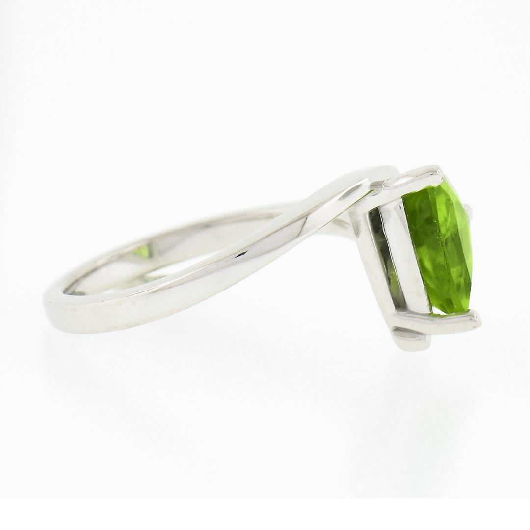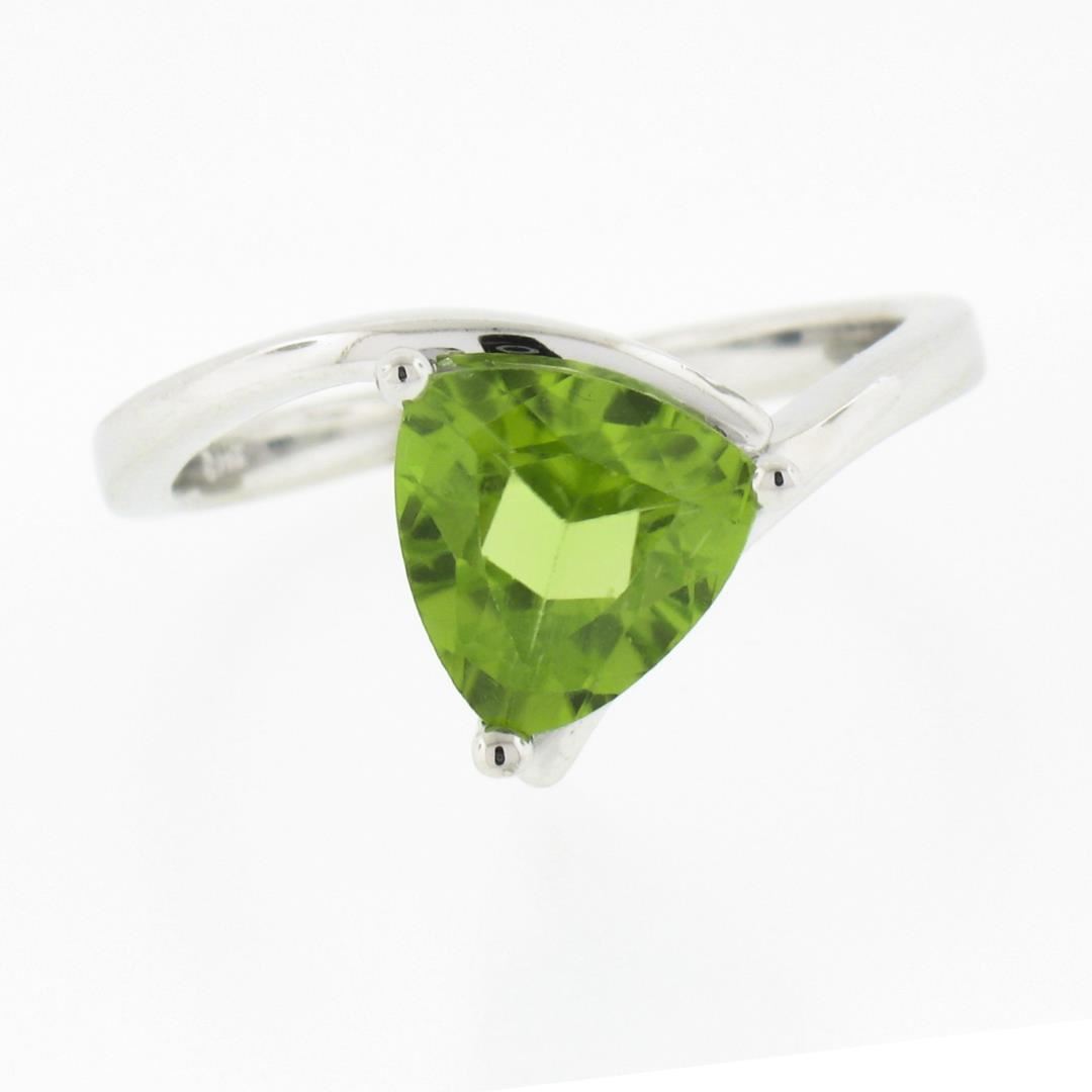 A solid 14k white gold bypass ring, with 1 trillion cut natural peridot (1.83ct ). The ring is size 7.0, weighs a total of 3.70 grams, and measures 10.70mm wide.