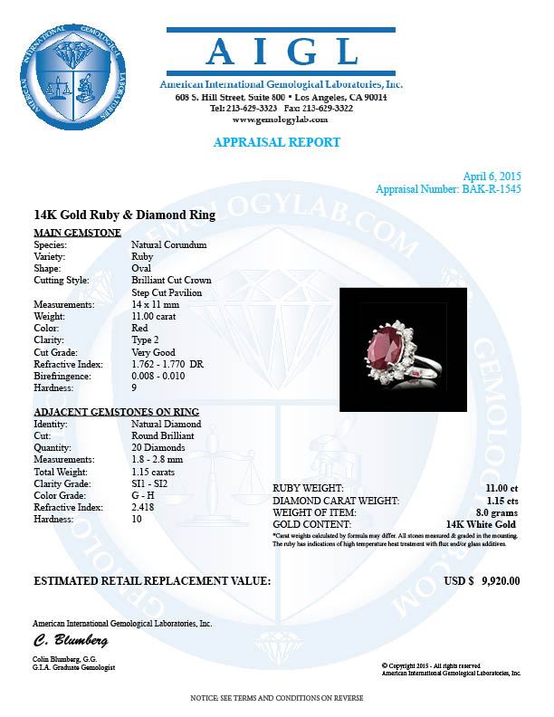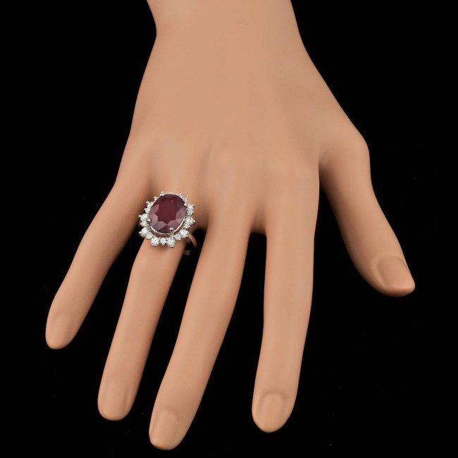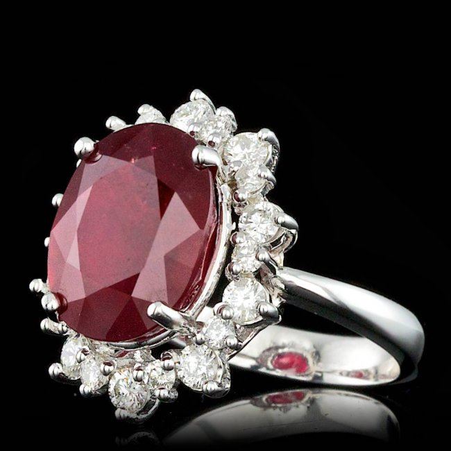 Retail: $9,800.00 ****** 14k White Gold 11.00ct Ruby 1.15ct Diamond Ring ****** Metal: 14k Solid White Gold / Size: 7.25 / Total Item Weight: 8.0 grams / Country Made: United States / / Main Stone: Ruby / Color: Red / Carat Total Weight: 11.00 / Treatment: Filling / Clarity: Type 2 / Cut: Very Good / / Secondary Stone: Diamond / Carat Total Weight: 1.15 / Treatment: None / Color Grade: G - H / Clarity: SI1 - SI2 / Cut: Very Good /