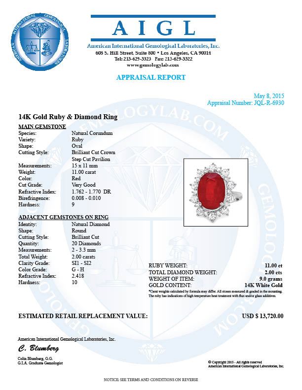 Retail: $13,600.00 ****** 14k White Gold 11.00ct Ruby 2.00ct Diamond Ring ****** Metal: 14k Solid White Gold / Size: 7.5 / Total Item Weight: 9.0 grams / Country Made: United States / / Main Stone: Ruby / Color: Red / Carat Total Weight: 11.00 / Treatment: Filling / Clarity: Type 2 / Cut: Very Good / / Secondary Stone: Diamond / Carat Total Weight: 2.00 / Treatment: None / Color Grade: G - H / Clarity: SI1 - SI2 / Cut: Very Good /