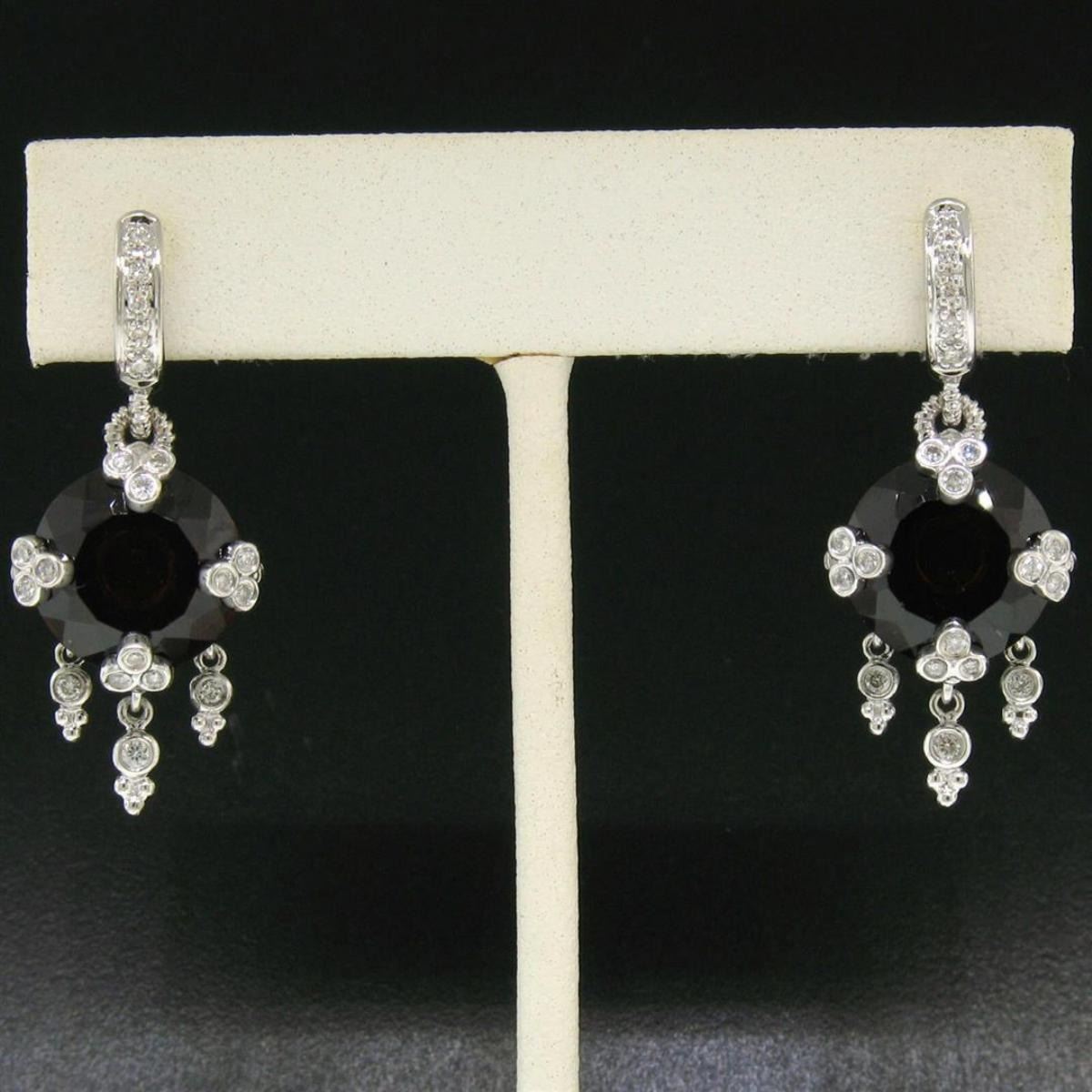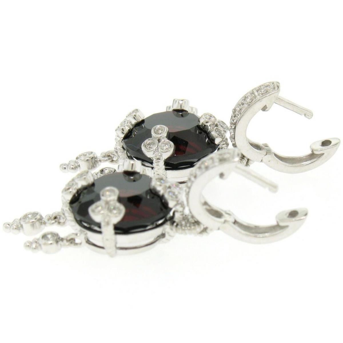 One 14k White Gold 11.2ctw Round Garnet Dangle Earrings w/ Brilliant Diamond Accents. Item Details: Material: 14k Solid White Gold, Weight: 10.3 Grams, Stone(s): (2) Natural Genuine Garnets - Round Cut - Prong Set - Deep Red Color - 11.0ctw (approx.), (40) Natural Genuine Diamonds - Round Brilliant Cut - Bezel & Prong Set - VS2 Clarity - H Color - 0.20ctw (approx.), Total Carat Weight: 11.20 (approx.), Backing: Snap Closures (Pierced ears required), Width: 15.2mm, Overall Height: 36.9mm. Overall Thickness: 9.10mm. Dangle Length: 25.65mm. Condition: Amazing - Like New!