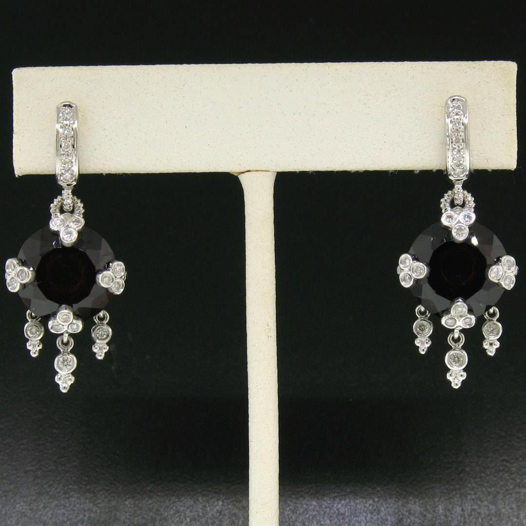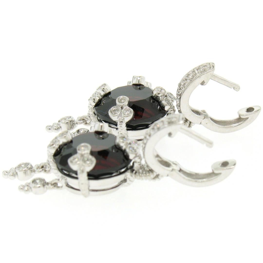 One Pair 14k White Gold 11.2ctw Round Garnet Dangle Earrings w/ Brilliant Diamond Accents. Item Details: Material: 14k Solid White Gold, Weight: 10.3 Grams, Stone(s): (2) Natural Genuine Garnets - Round Cut - Prong Set - Deep Red Color - 11.0 ctw (approx.), (40) Natural Genuine Diamonds - Round Brilliant Cut - Bezel & Prong Set - VS2 Clarity - H Color - 0.20 ctw (approx.), Total Carat Weight: 11.20 (approx.), Backing: Snap Closures (Pierced ears required), Width: 15.2mm, Overall Height: 36.9mm. Overall Thickness: 9.10mm. Dangle Length: 25.65mm. Condition: Amazing - Like New!