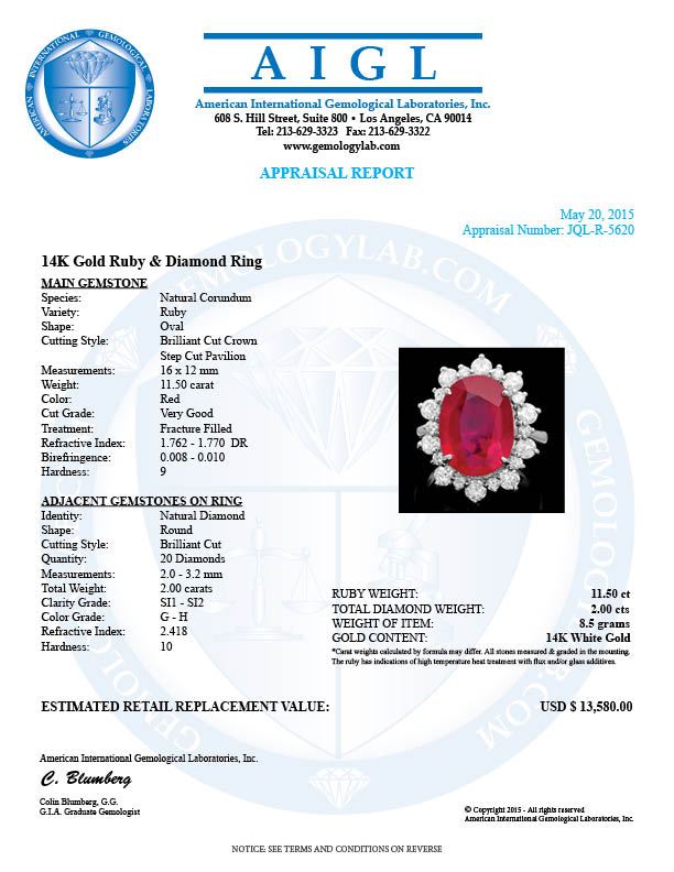 Retail: $13,460.00 ****** 14k White Gold 11.50ct Ruby 2.00ct Diamond Ring ****** Metal: 14k Solid White Gold / Size: 8 / Total Item Weight: 8.5 grams / Country Made: United States / / Main Stone: Ruby / Color: Red / Carat Total Weight: 11.50 / Treatment: Filling / Clarity: Type 2 / Cut: Very Good / / Secondary Stone: Diamond / Carat Total Weight: 2.00 / Treatment: None / Color Grade: G - H / Clarity: SI1 - SI2 / Cut: Very Good /